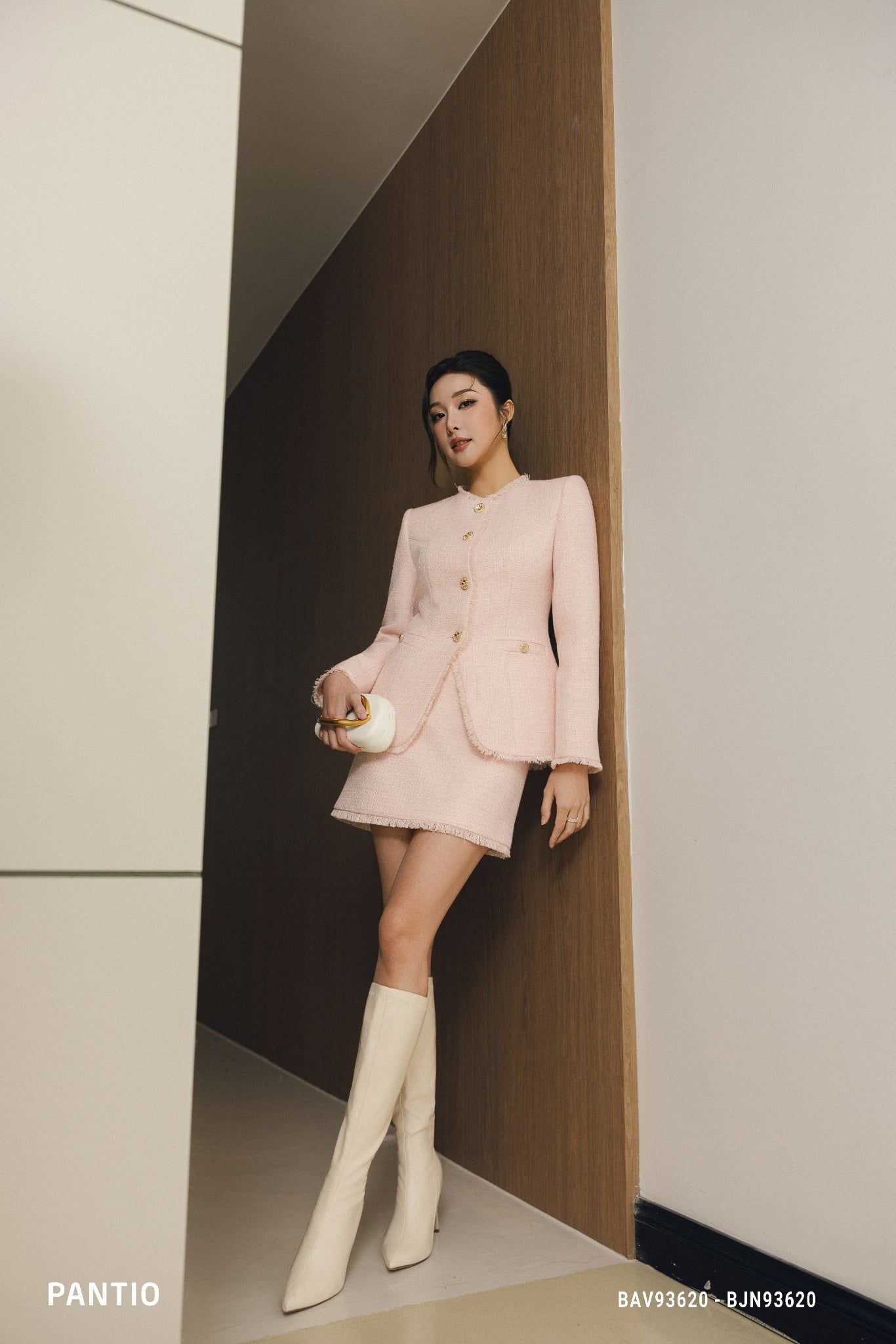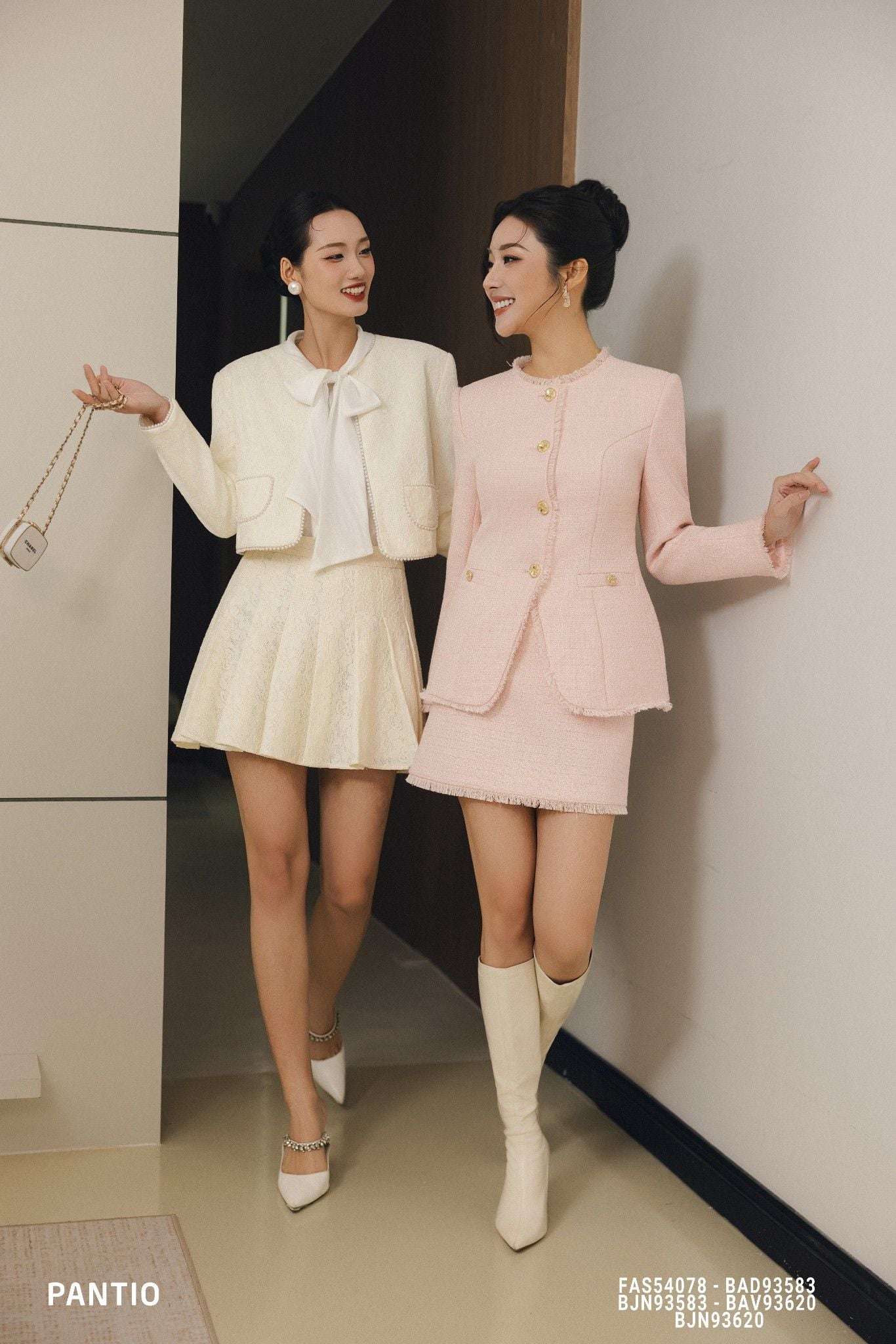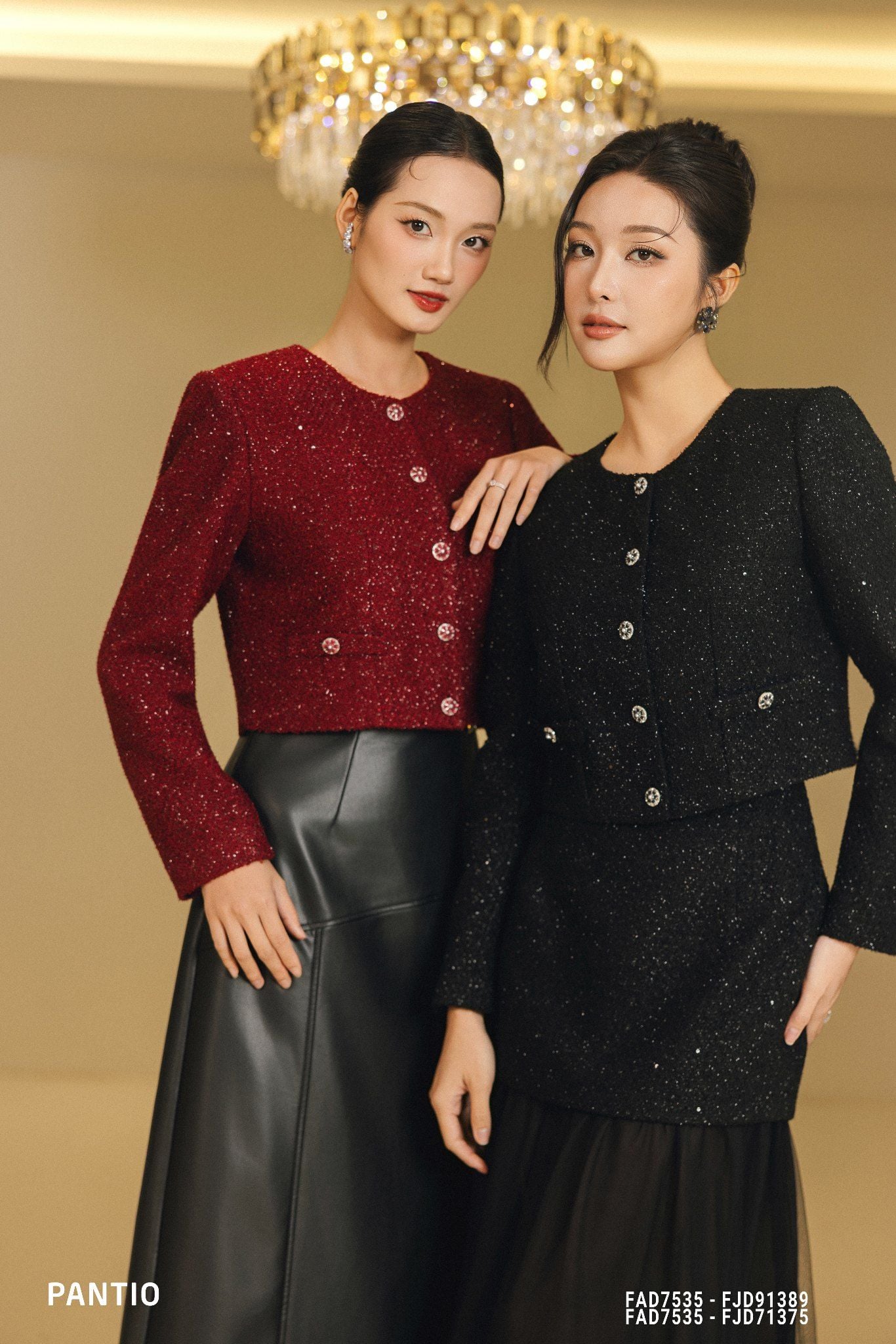 Lookbook 𝗧𝗛𝗘 𝗚𝗥𝗔𝗡𝗗 𝗔𝗟𝗟𝗨𝗥𝗘 cũng ghi điểm với các set phối mang tinh thần hiện đại. Áo vest dạ tweed dáng ôm phối tua rua, đính khuy đá lấp lánh khi mix cùng chân váy ngắn đồng chất liệu tạo nên hình ảnh quý cô thành thị sang trọng, thời thượng. Trong khi đó, áo khoác dạ dáng ngắn tay bồng nhẹ phối chân váy xòe điểm lưới mang lại vẻ ngoài ngọt ngào nhưng vẫn nổi bật giữa không gian tiệc. Thiết kế sơ mi suông cổ đức phối ren hoa layer cùng đầm hai dây cổ vuông cũng là lựa chọn thú vị cho những dịp cần sự thanh lịch tinh tế.