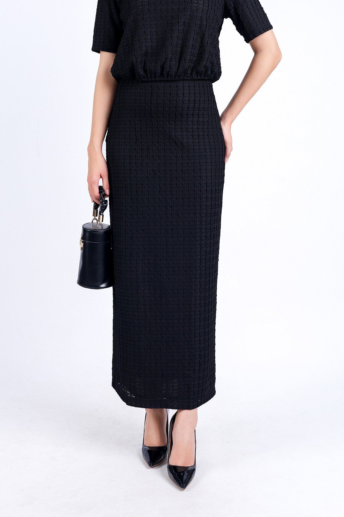 BJD73211 - Chân váy công sở vải tơ phối ren hai hớp dáng suông dài khoá thân sau - PANTIO