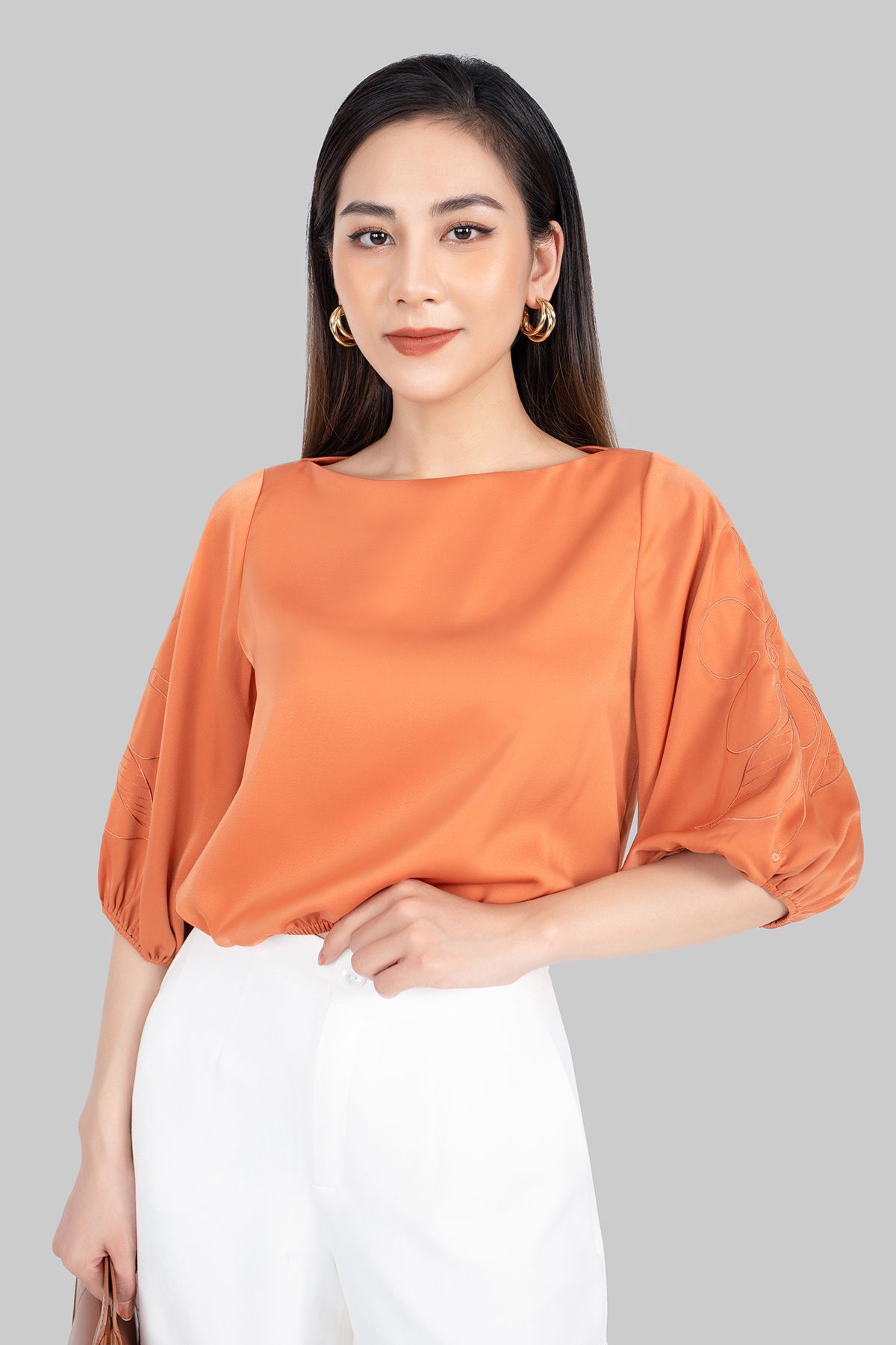 FAS33236 - Áo sơ mi công sở vải lụa dáng croptop cổ thuyền tay bồng phối thêu - PANTIO