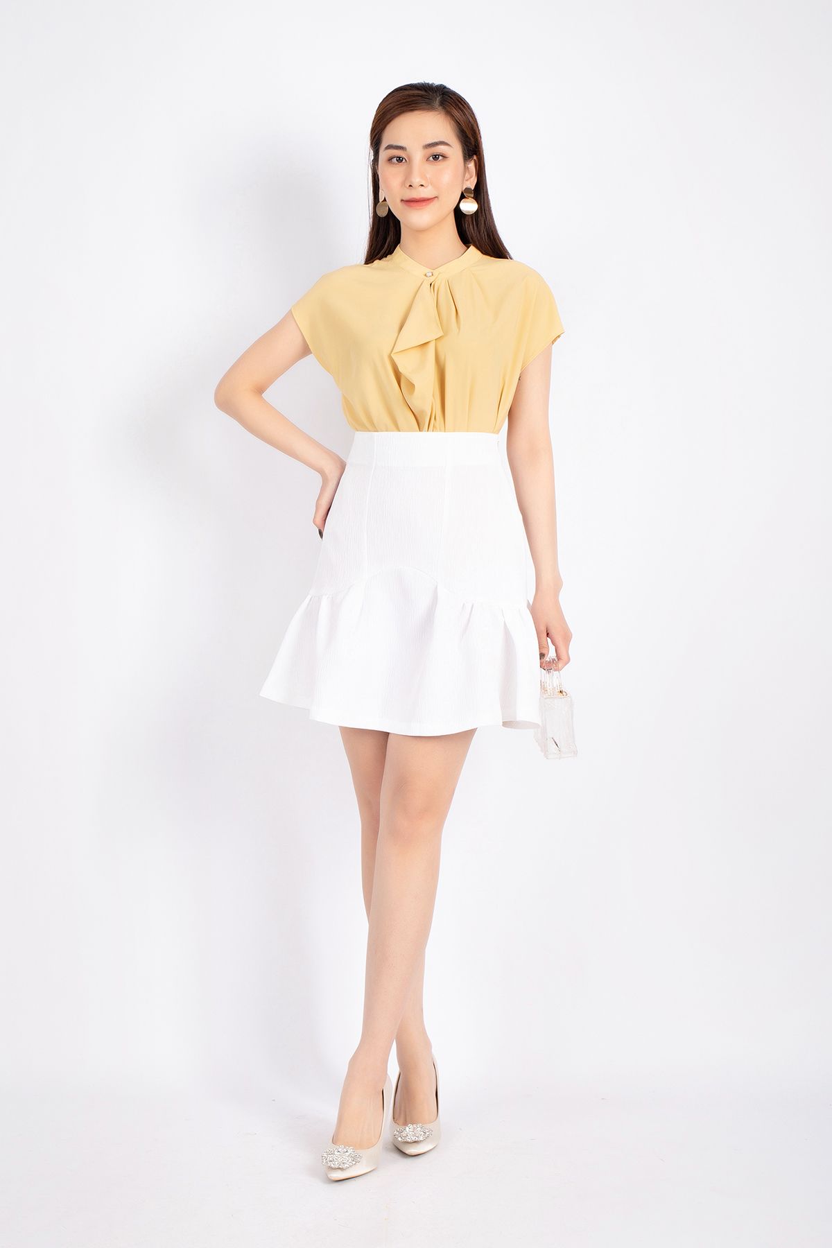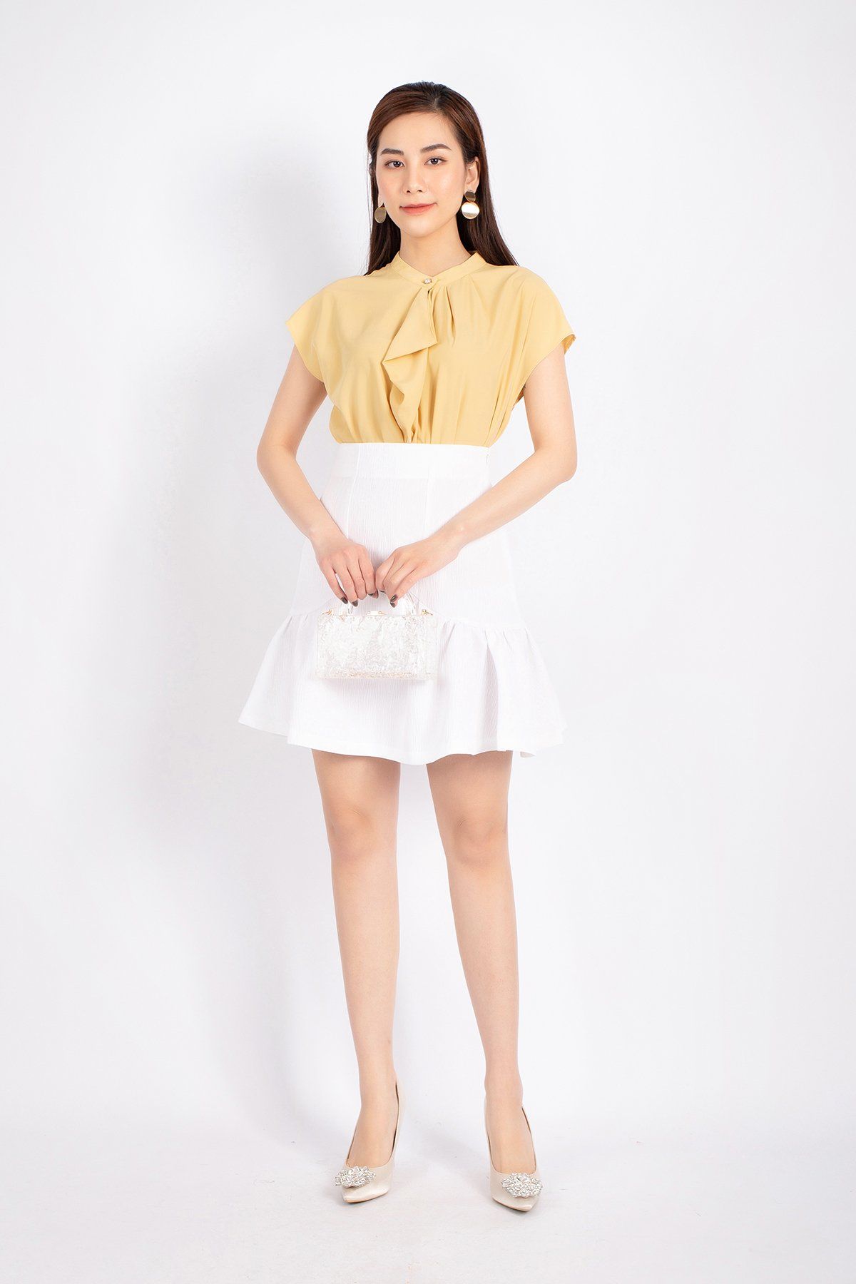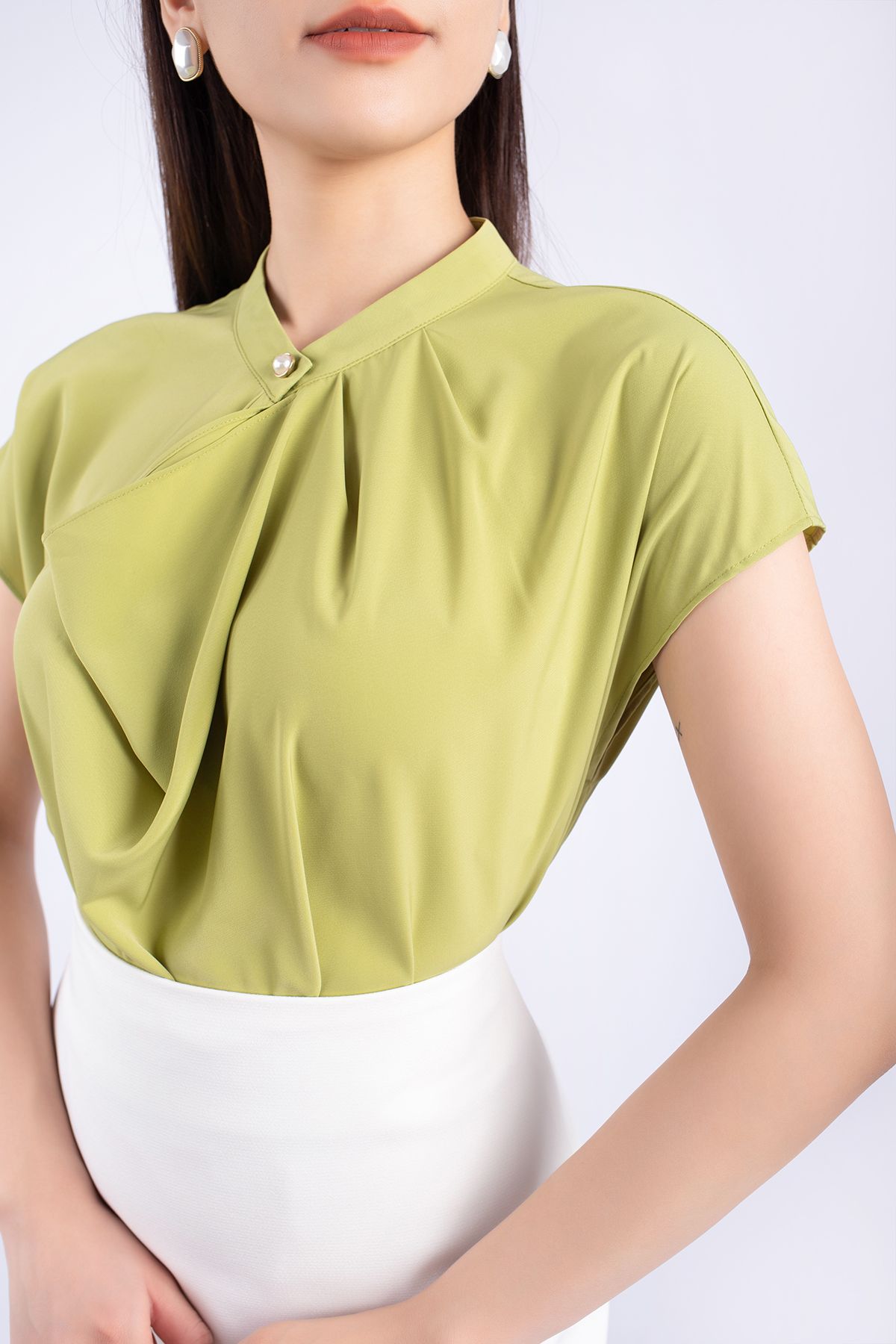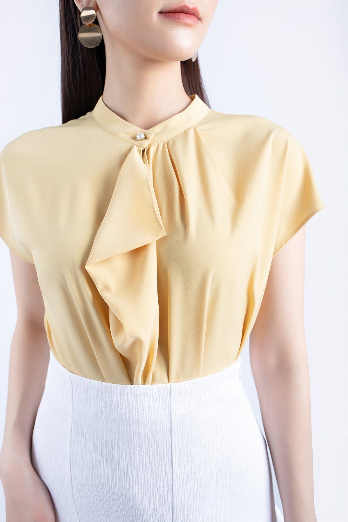 FAS33361 - Áo kiểu công sở vải lụa dáng suông cổ xếp nếp đổ bèo tạo kiểu vai liền - PANTIO