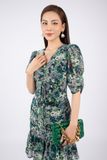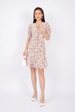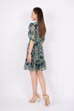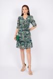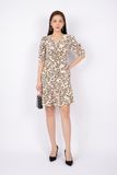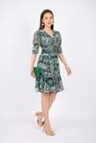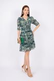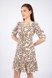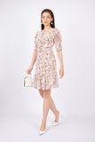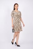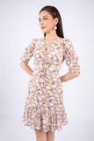 FDC33585 - Đầm công sở vải lụa dáng ôm chân xòe cổ V nhún nơ tay bồng thân xếp nếp - PANTIO