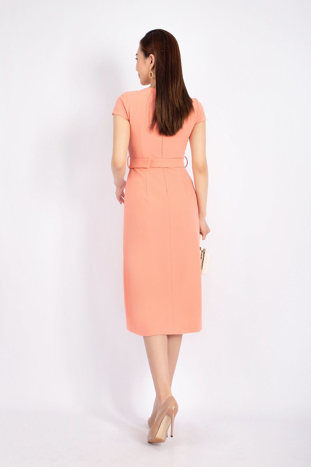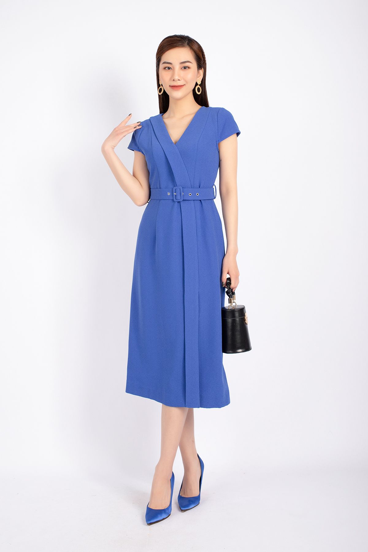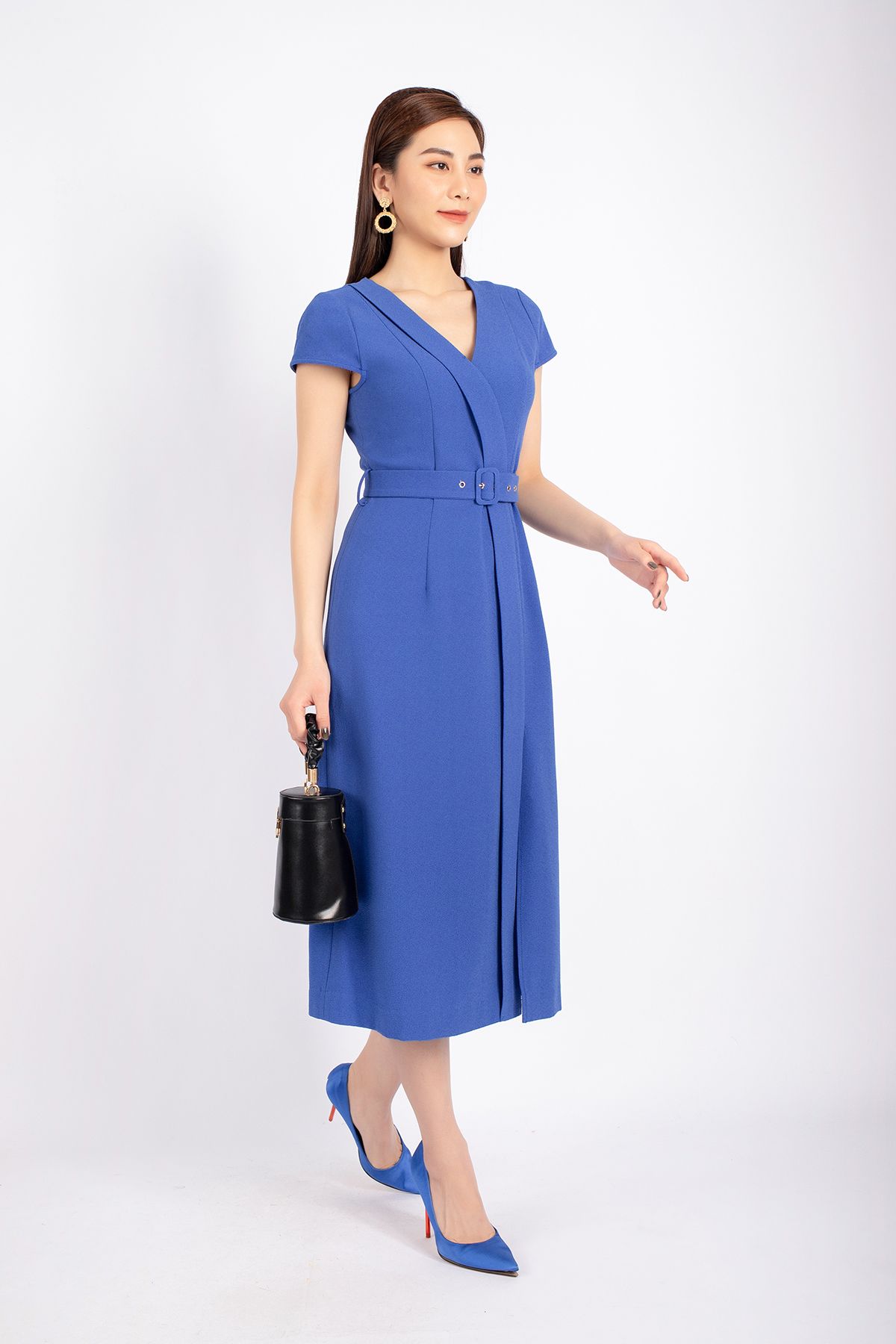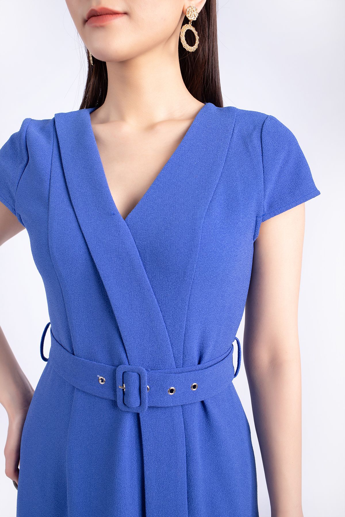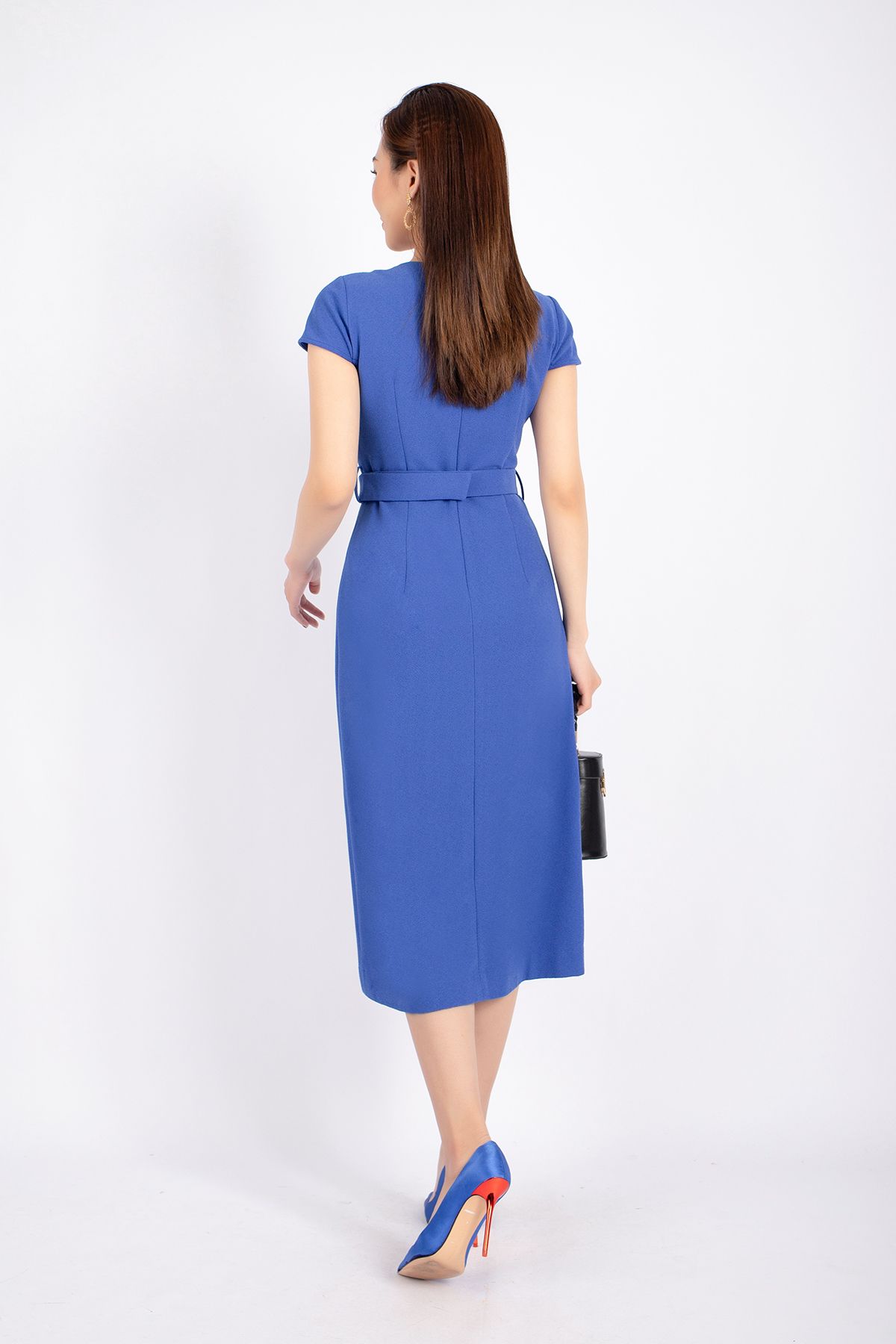FDC33803 - Đầm công sở vải phi cát dáng A cổ V vạt lệch xẻ đùi kèm đai tạo kiểu khóa thân sau - PANTIO
