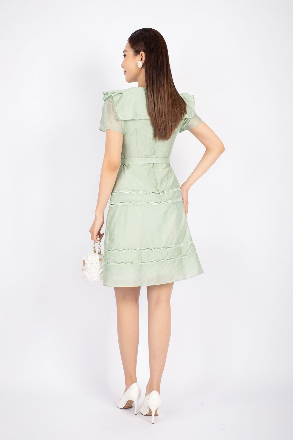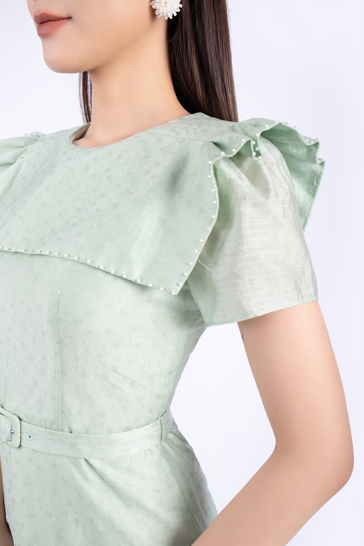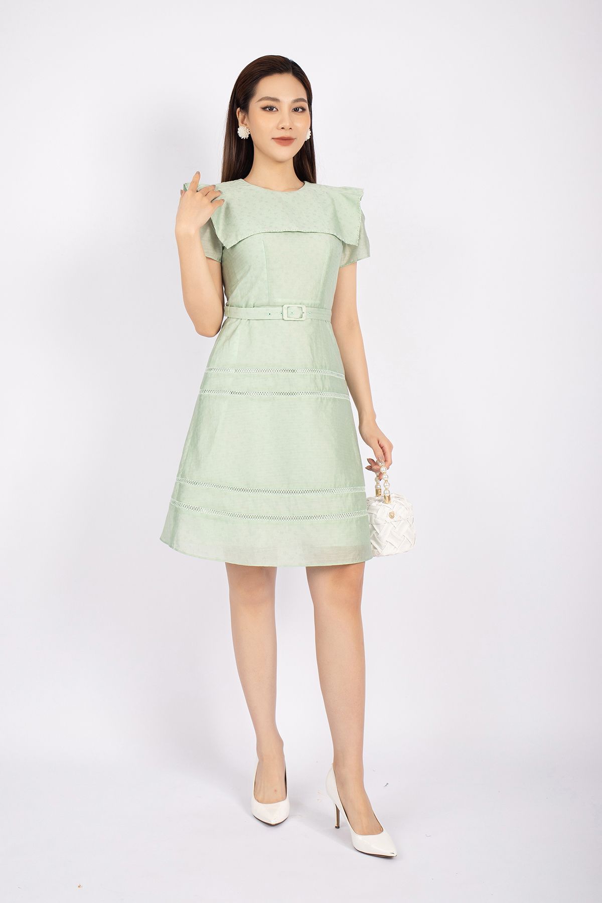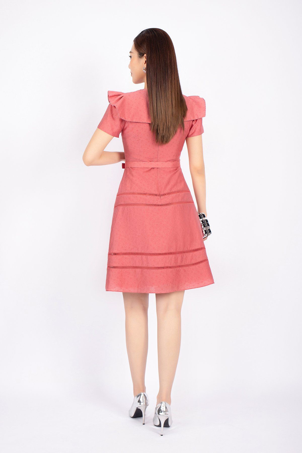 FDC73537 - Đầm công sở vải thô dáng A cổ tròn vai xếp nếp tạo kiểu kèm thắt lưng trang trí - PANTIO