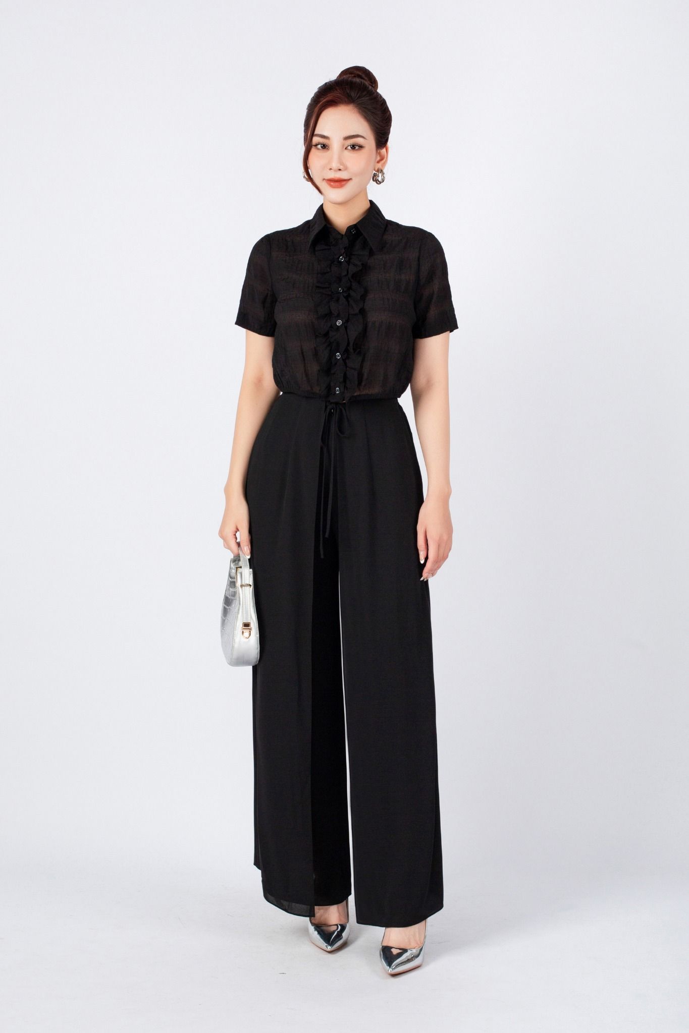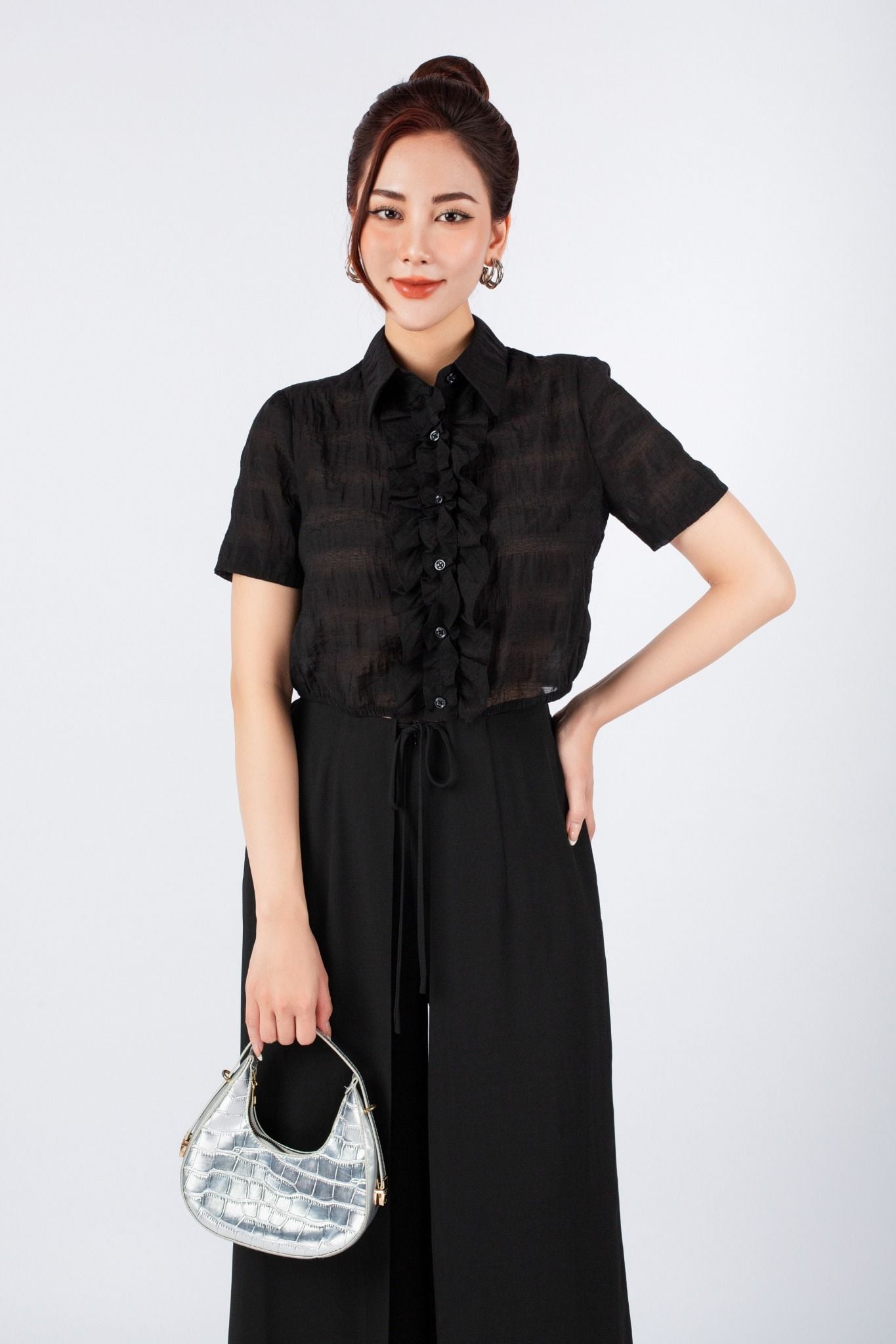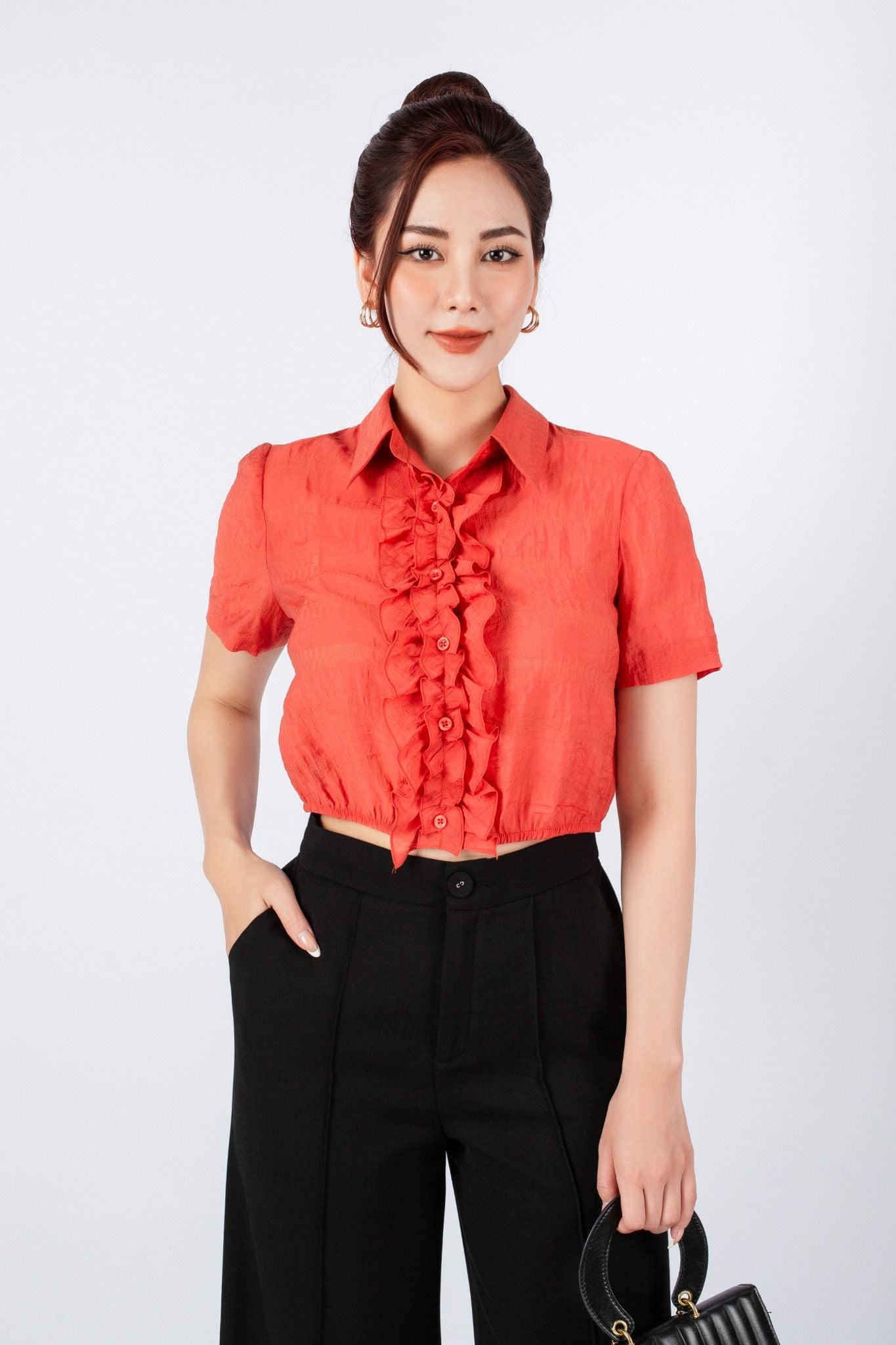 FAS53601 - Áo kiểu công sở vải thô mỏng dáng croptop cổ đức nẹp khuy phối bèo trang trí gấu bo chun - PANTIO
