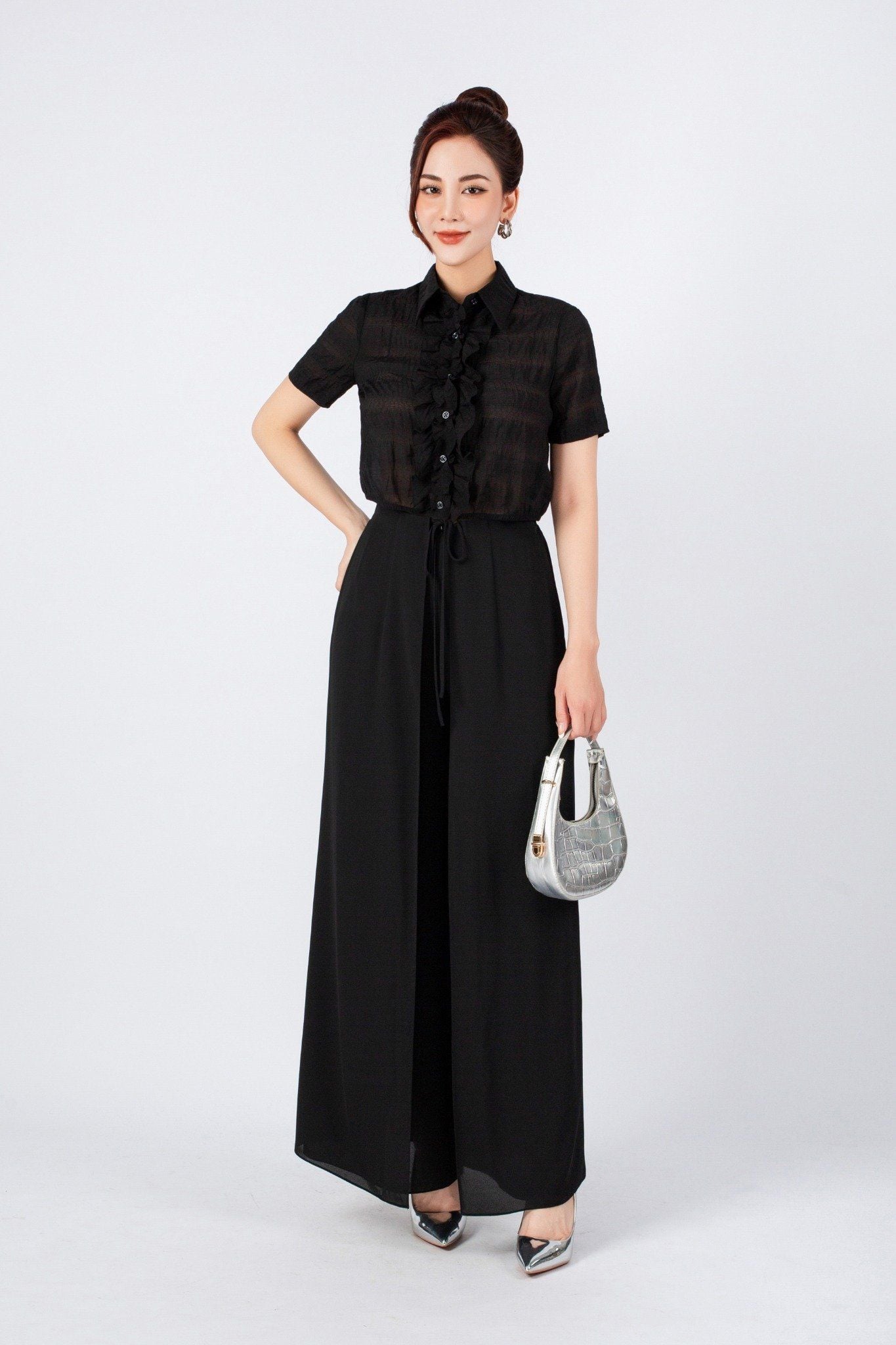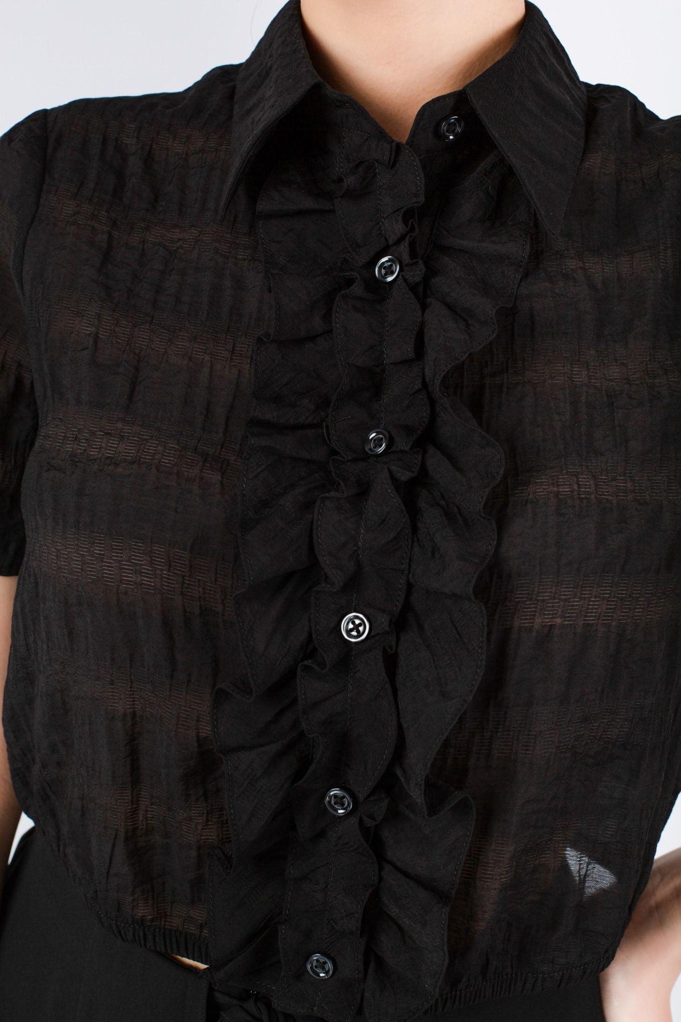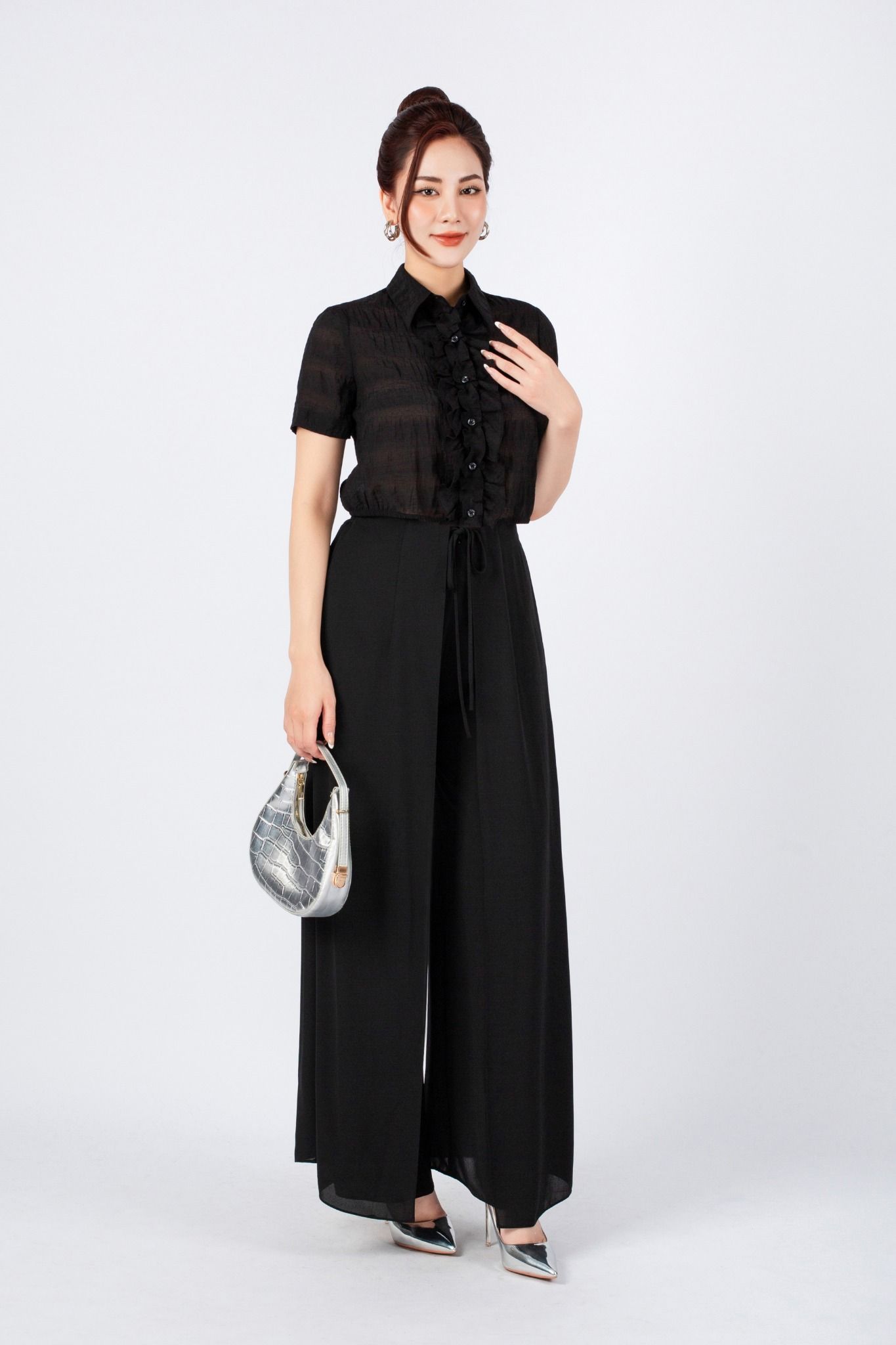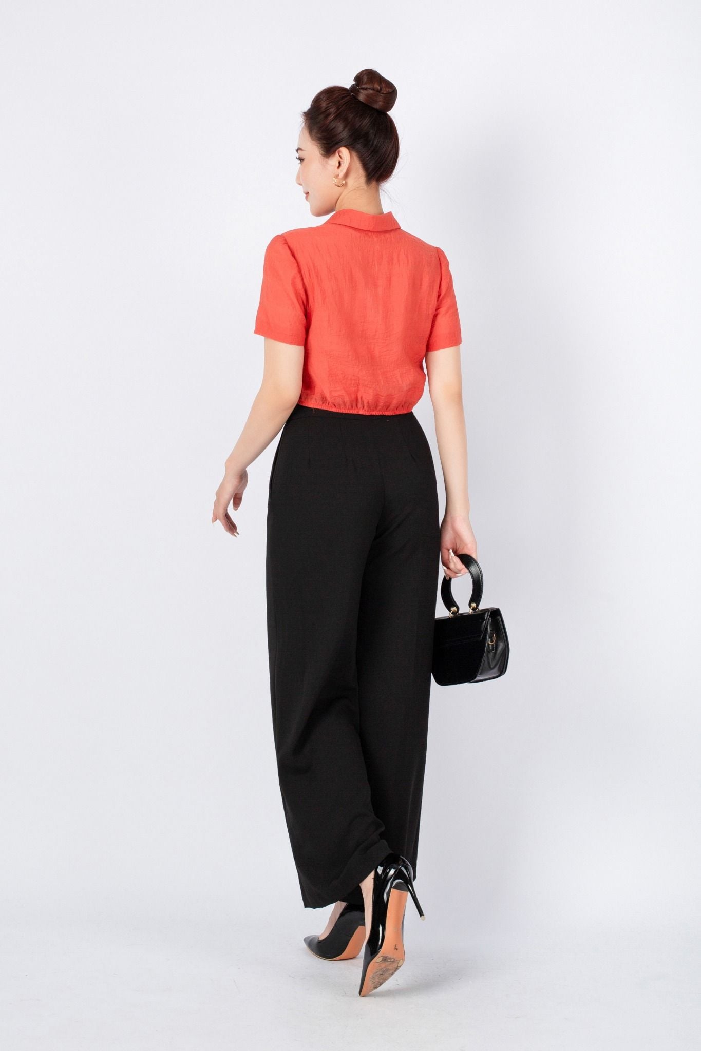 FAS53601 - Áo kiểu công sở vải thô mỏng dáng croptop cổ đức nẹp khuy phối bèo trang trí gấu bo chun - PANTIO