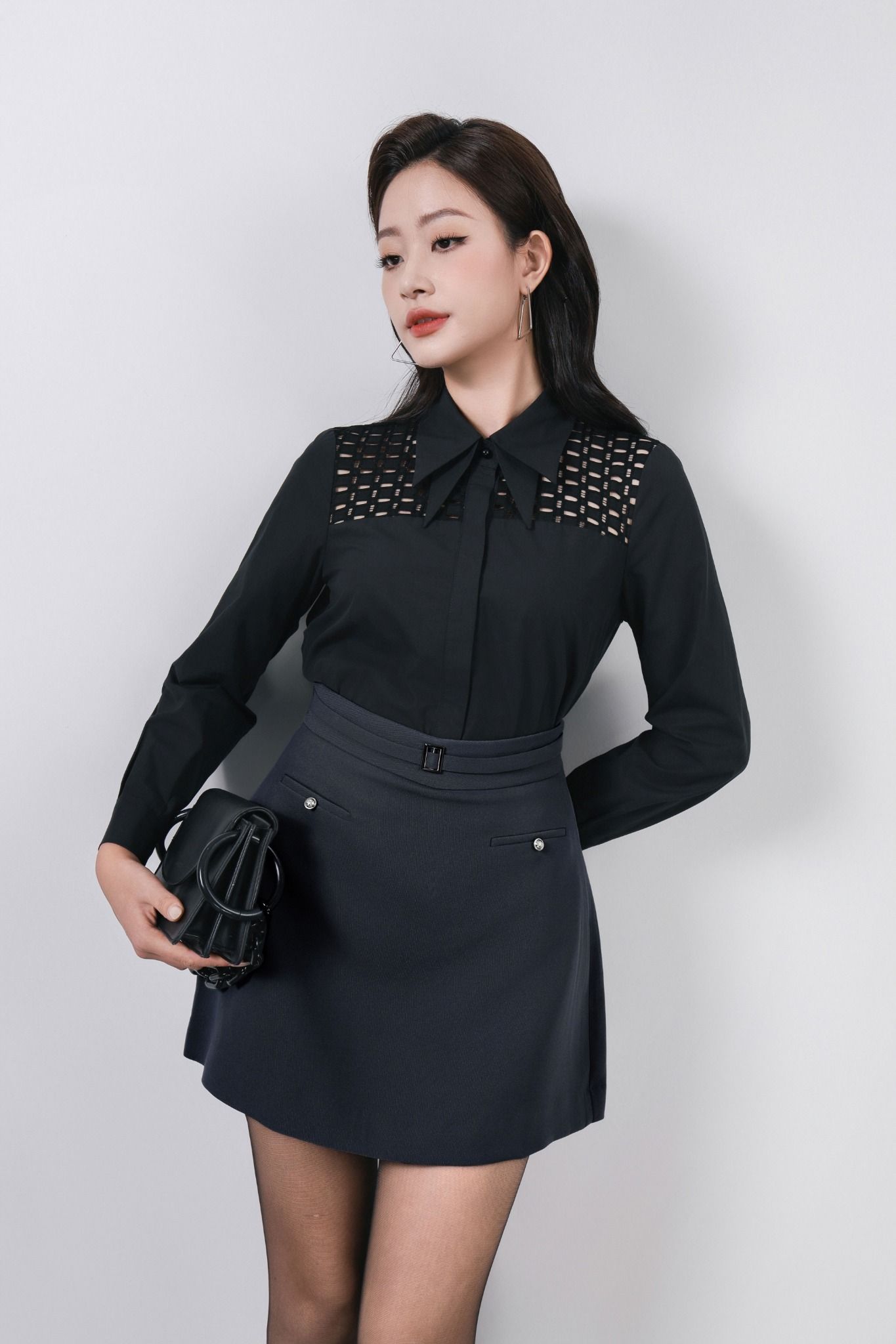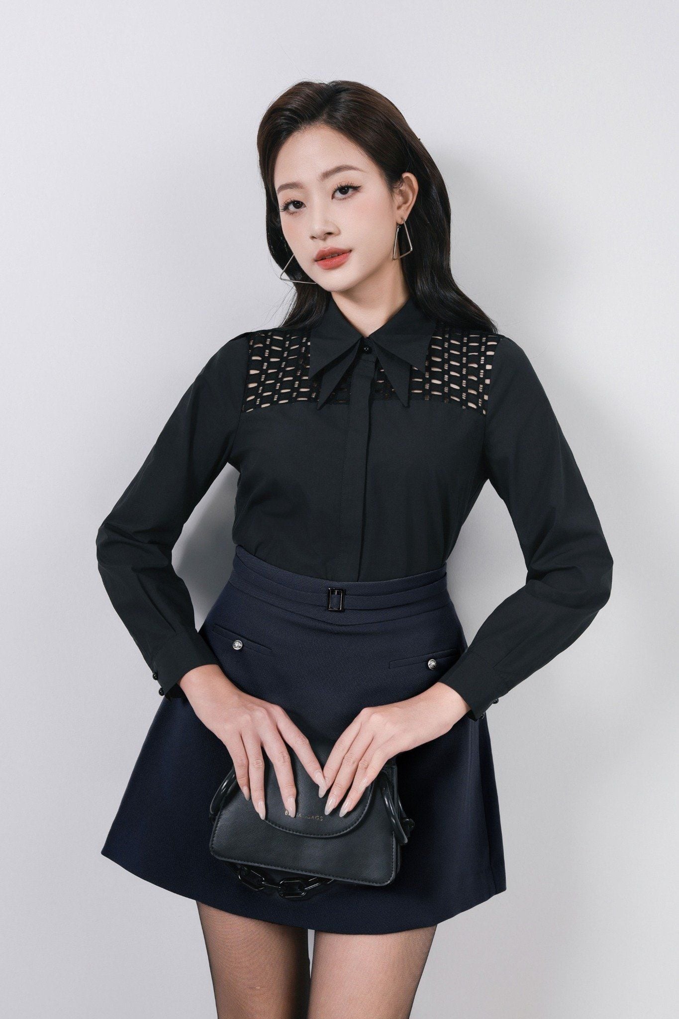 FAS53953 - Áo sơ mi công sở vải thô kate dáng suông cổ kiểu thời trang thân áo phối ren tạo kiểu cài khuy thân trước - PANTIO