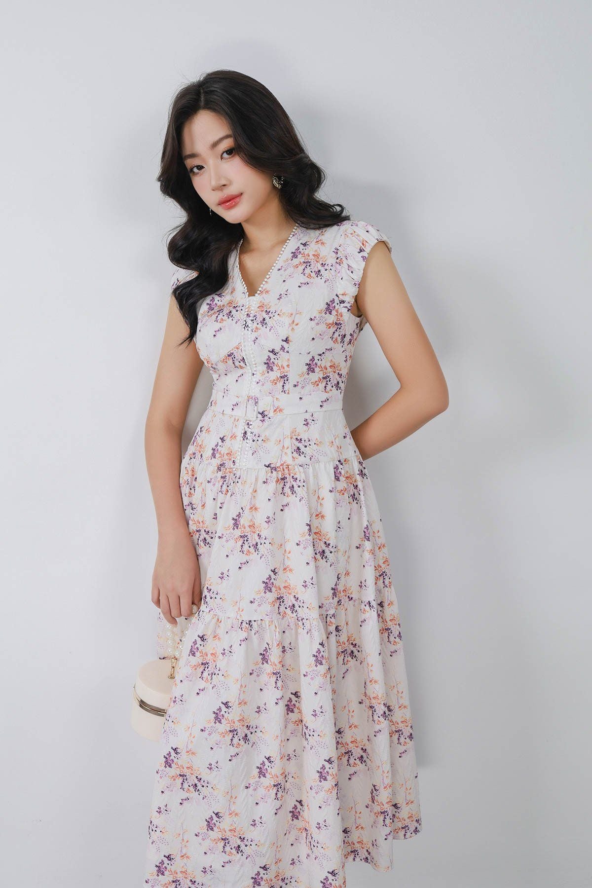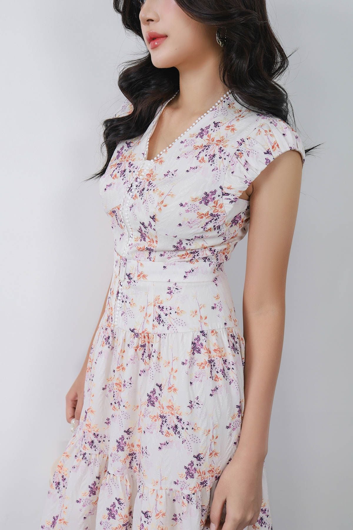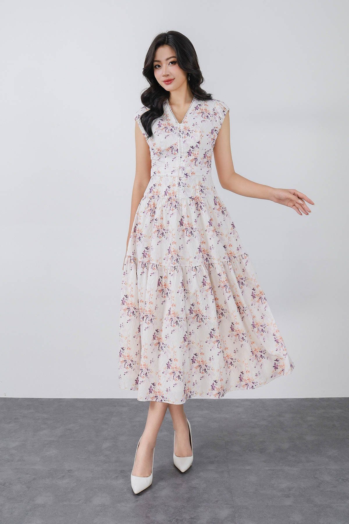 FDC15239 - Đầm công sở vải thô xốp cổ xẻ V vai chờm thân váy phối ly bung tạo xoè khoá thân sau - PANTIO