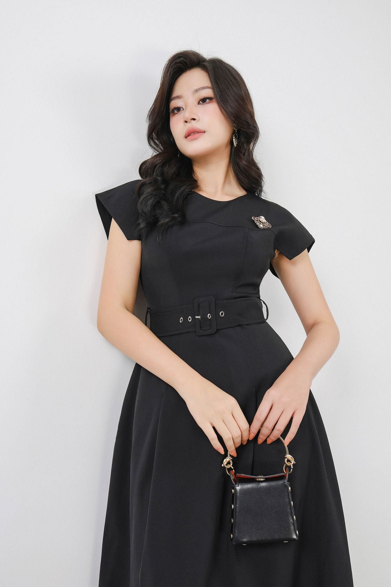 FDC34053 - Đầm công sở vải tuytsi dáng xòe có lót vải habutai cổ tròn vai chờm phối kèm đai tạo kiểu khóa thân sau - PANTIO