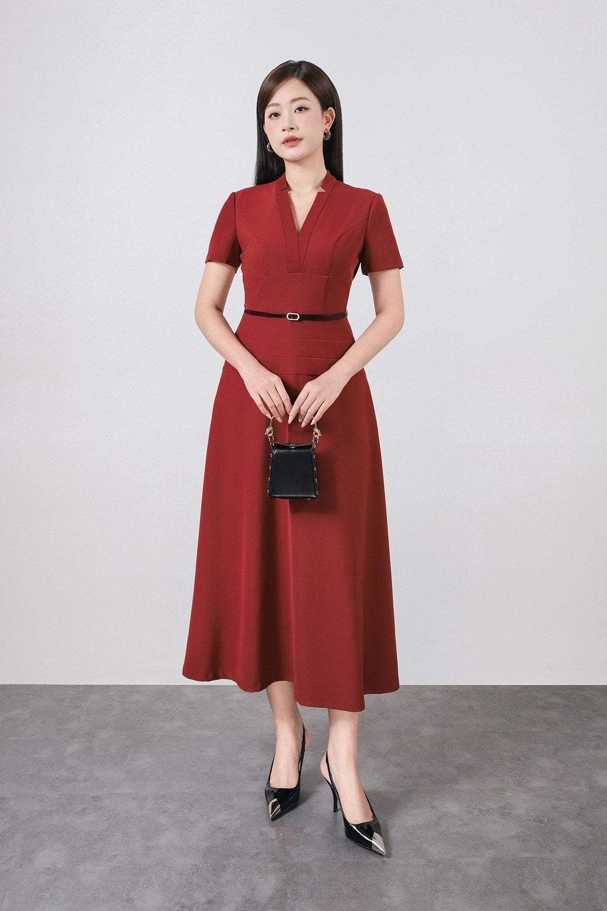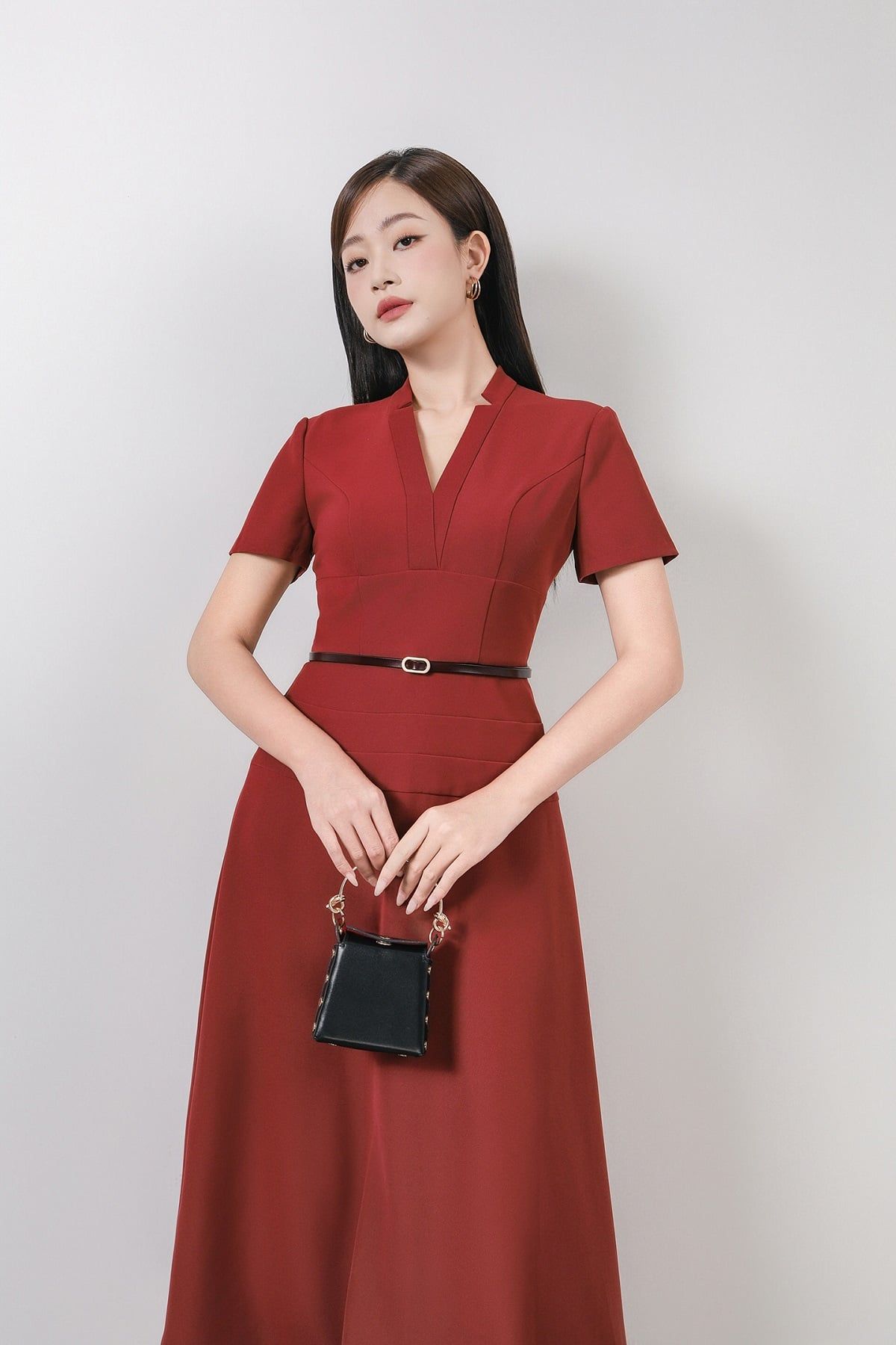 FDC35323 - Đầm công sở vải thô dáng A cổ xẻ V tay ngắn thân váy phối đường viền tạo kiểu khoá thân sau ( không kèm đai ) - PANTIO