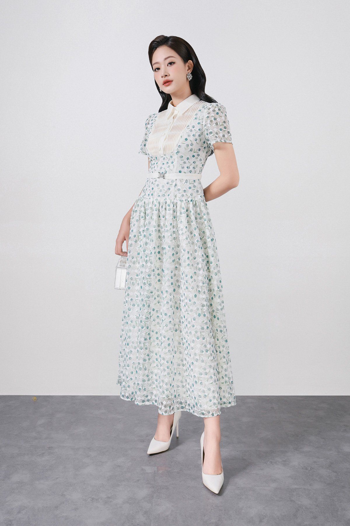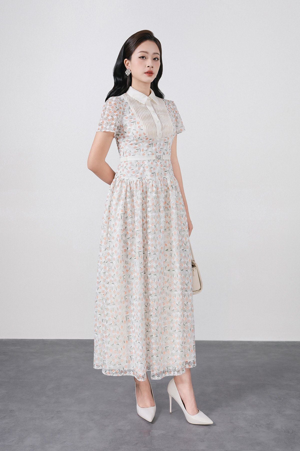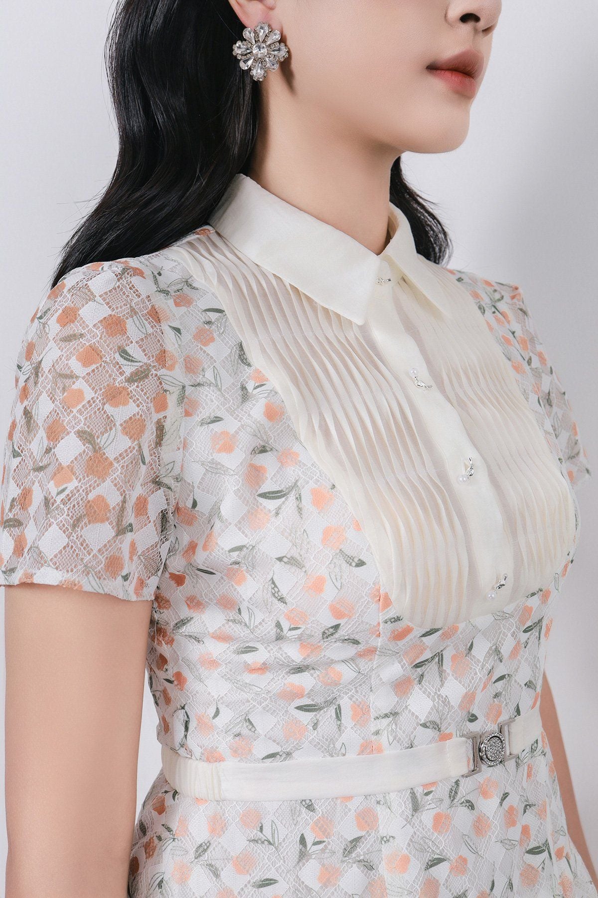 FDC35369 - Đầm công sở vải ren hoa cao cấp cổ bẻ ngực áo phối ly thân váy xếp ly bung tạo xoè kèm dây đai tạo kiểu khoá thân sau - PANTIO