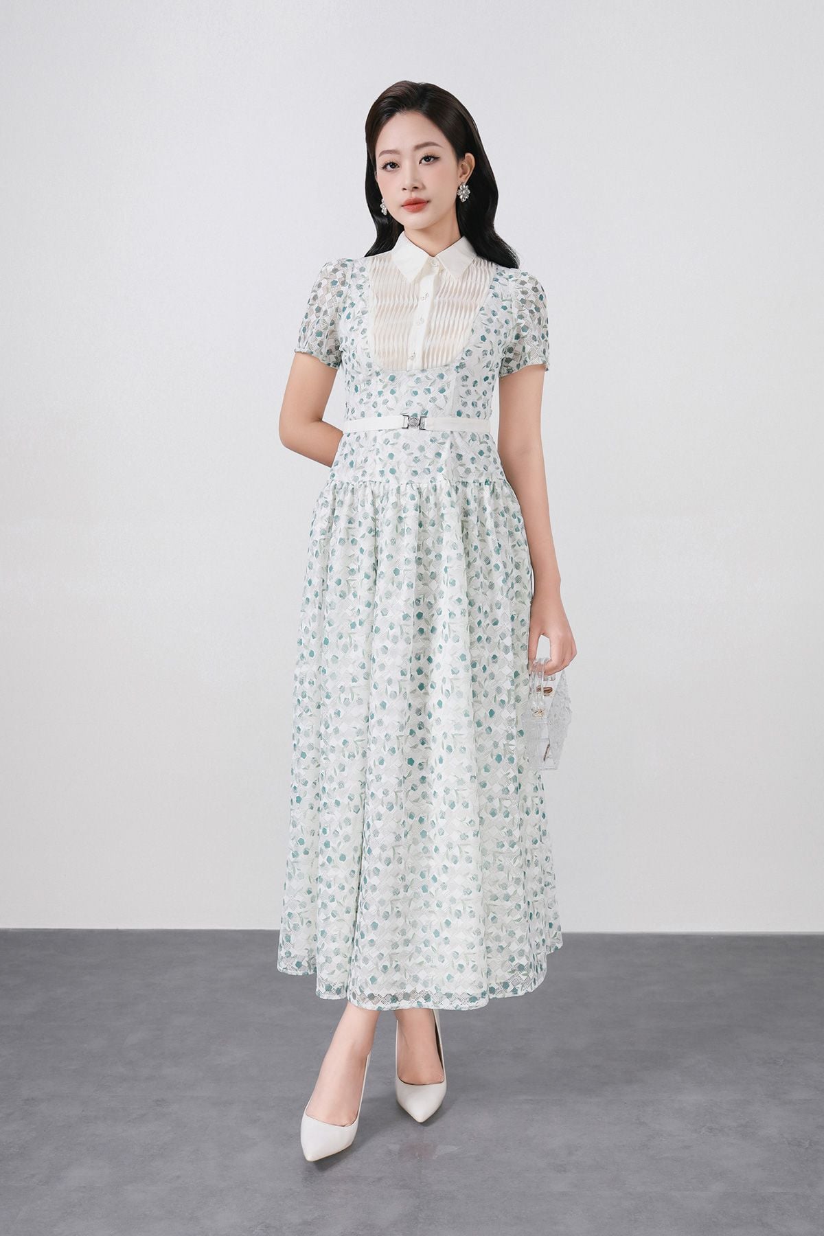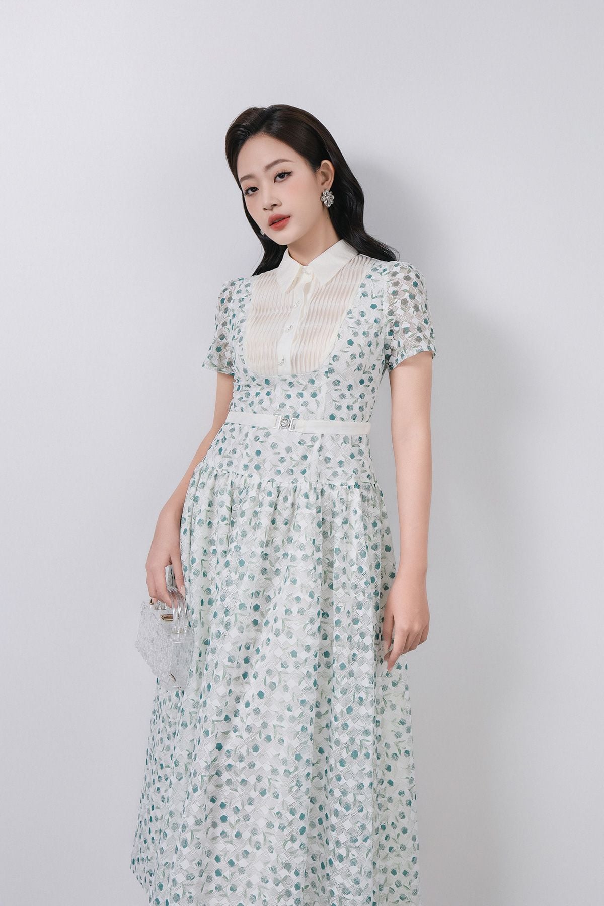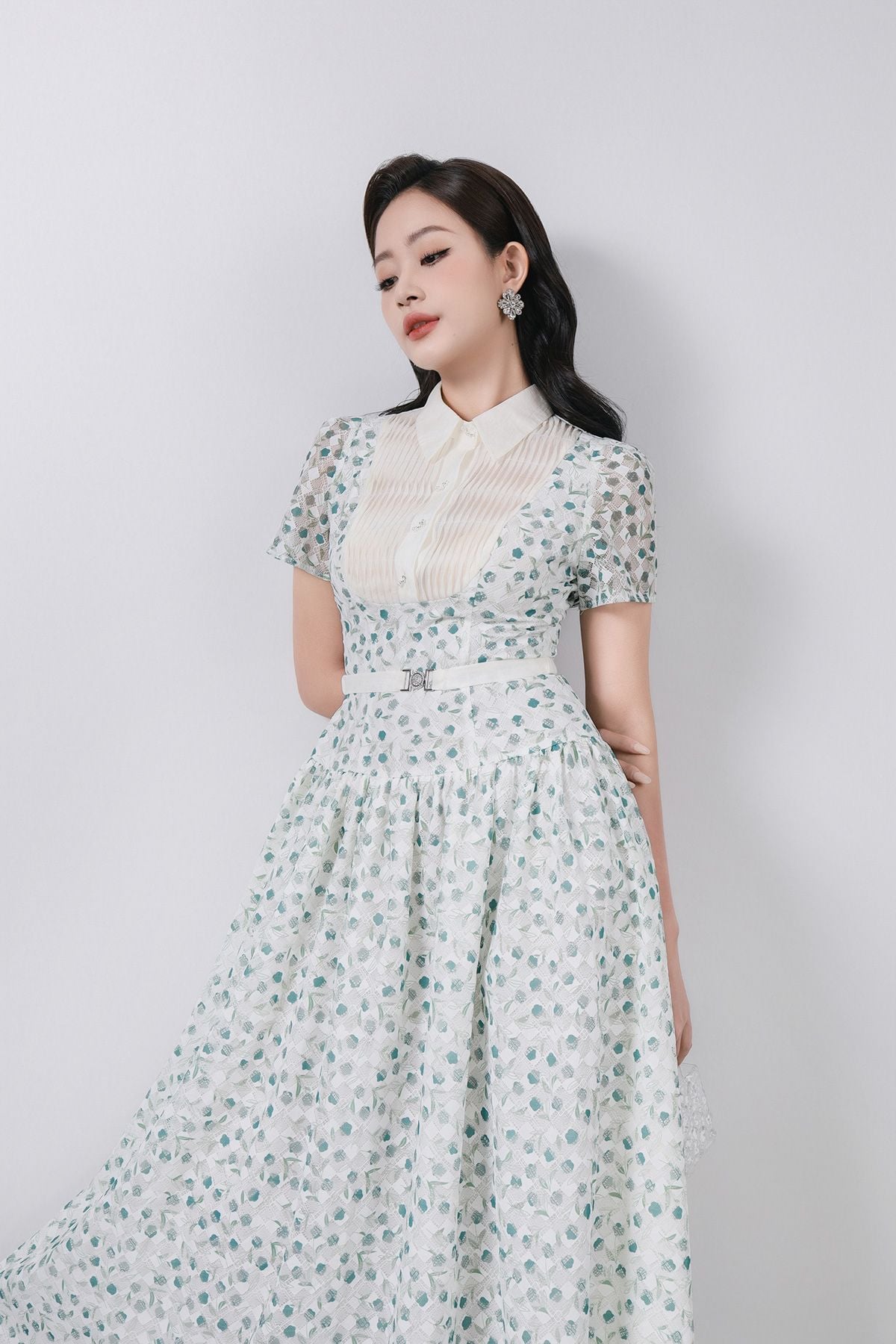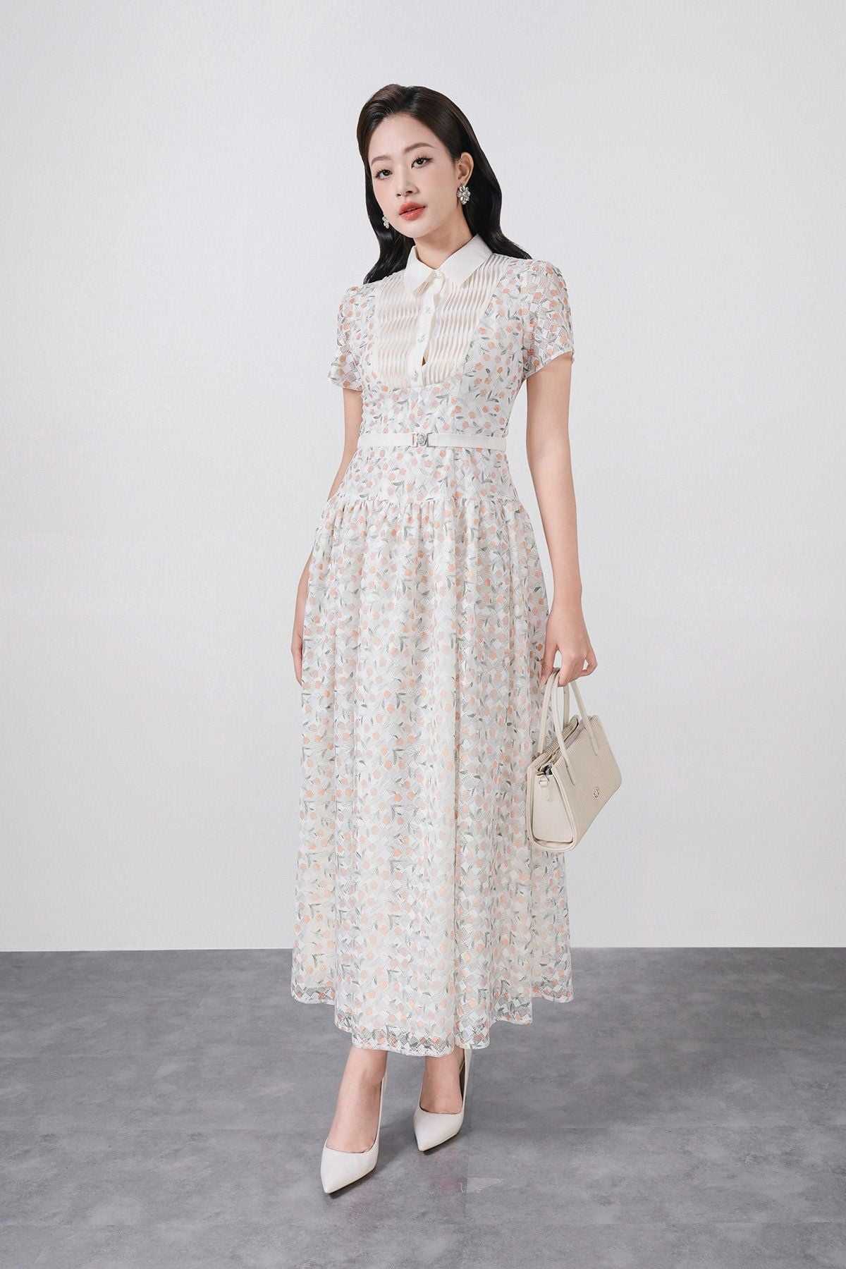 FDC35369 - Đầm công sở vải ren hoa cao cấp cổ bẻ ngực áo phối ly thân váy xếp ly bung tạo xoè kèm dây đai tạo kiểu khoá thân sau - PANTIO