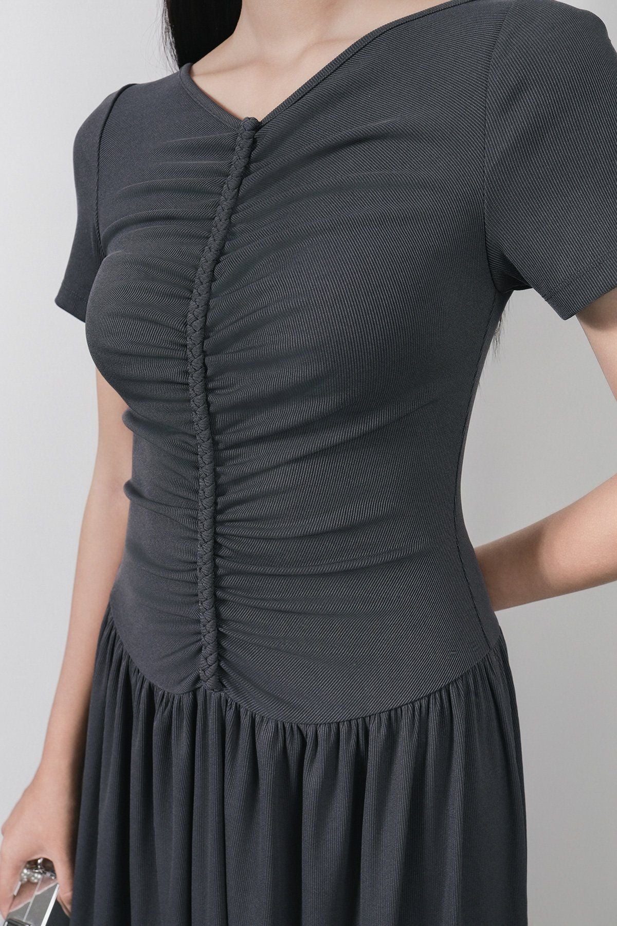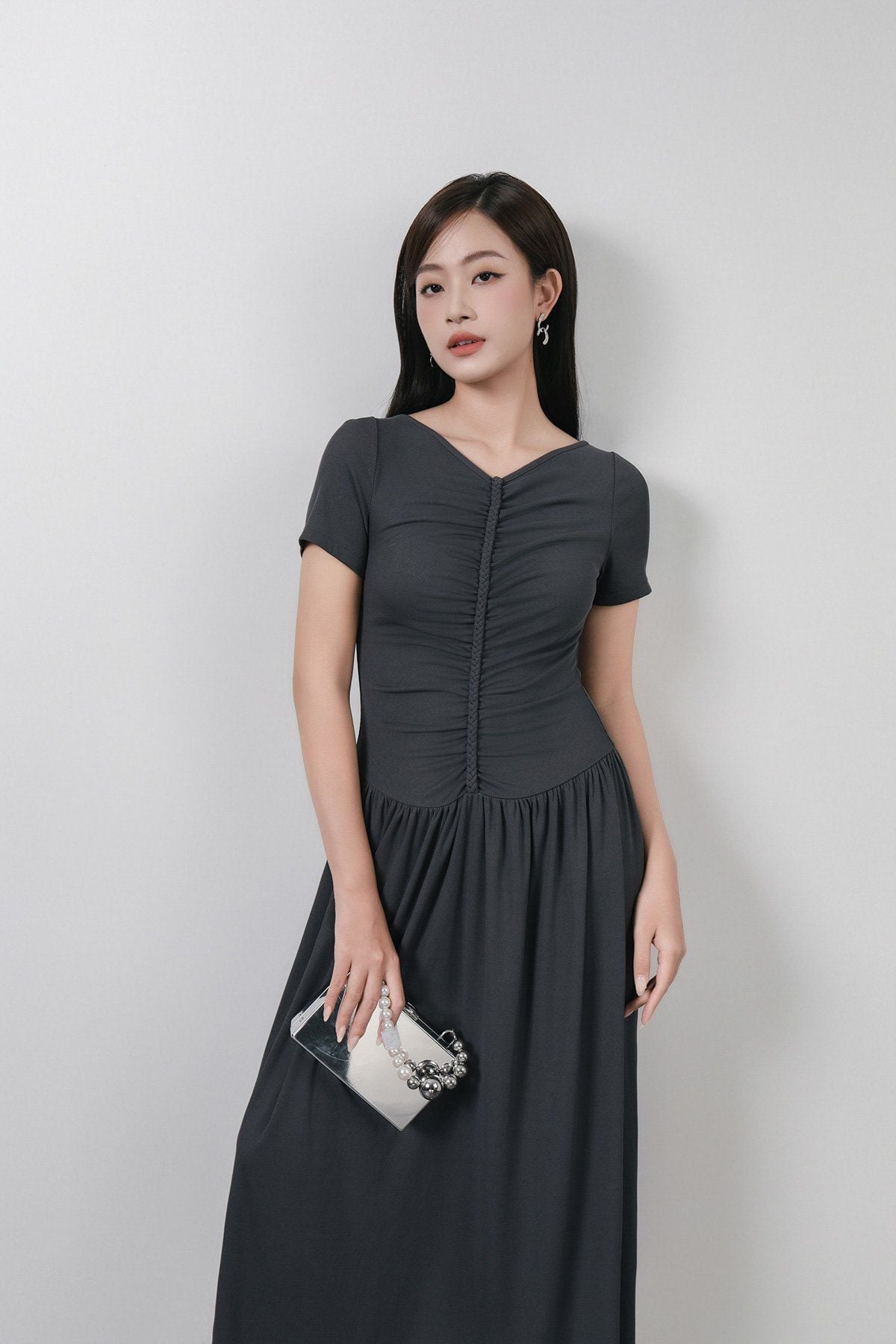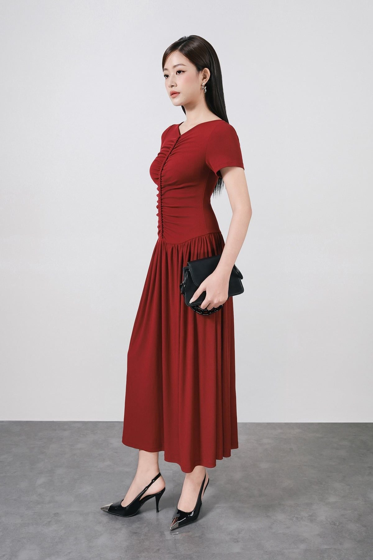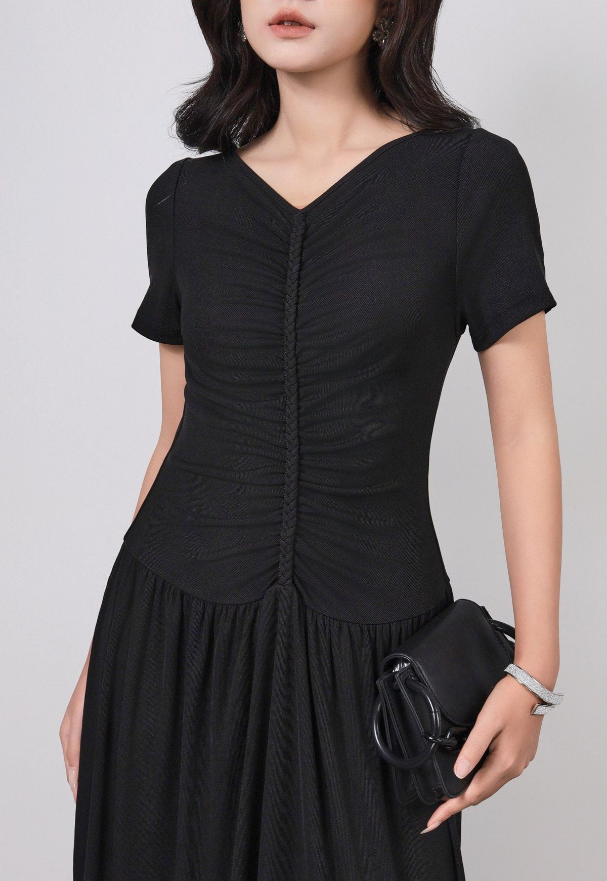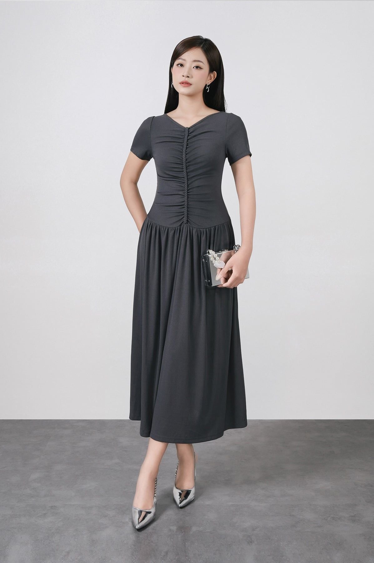FDD3180 - Đầm dệt kim vải len co giãn dáng ôm cổ xẻ V tay ngắn ngực phối nhún tạo kiểu - PANTIO