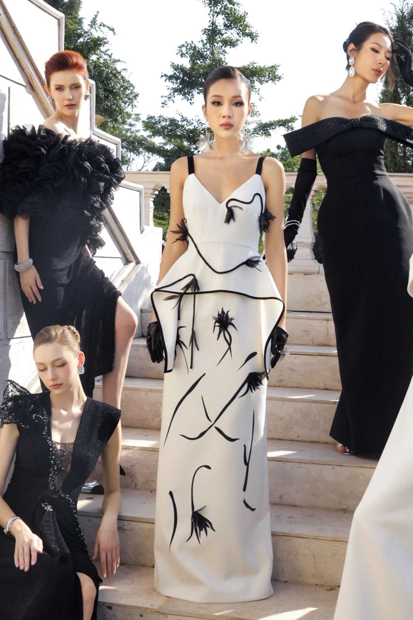 Thiết kế đầm dáng suông hai dây này là tuyên ngôn cho vẻ đẹp thanh thoát và tự do của người phụ nữ hiện đại. Với phần cổ xẻ chữ V tôn dáng cùng chi tiết vạt tạo kiểu đầy dụng ý, tổng thể trang phục như được điêu khắc nên để gợi cảm một cách kín đáo, đồng thời giữ trọn sự tinh tế khó cưỡng. Phom dáng suông kết hợp cùng phần peplum mềm mại tạo hiệu ứng thị giác làm nổi bật vòng eo, mang đến sự hài hòa về tỉ lệ và chuyển động đầy uyển chuyển. Những chi tiết trang trí đen trắng mang hơi hướng siêu thực, như bước ra từ thế giới fantasy, tạo nên bản hòa âm giữa nghệ thuật hình khối và cảm xúc cá nhân. Dù xuất hiện trong một buổi dạo phố, một bữa tiệc nhẹ hay một khung hình đậm chất nghệ thuật, thiết kế này đều đủ sức biến người mặc thành tâm điểm của ánh nhìn, không ồn ào nhưng không thể lướt qua.