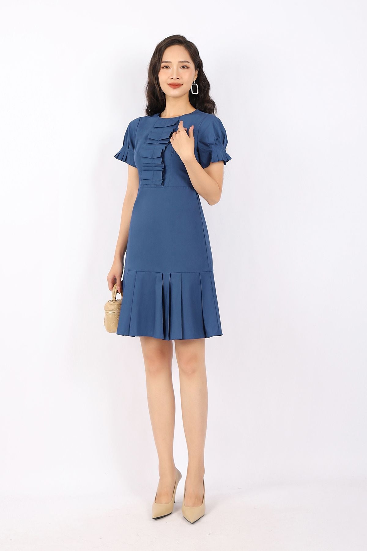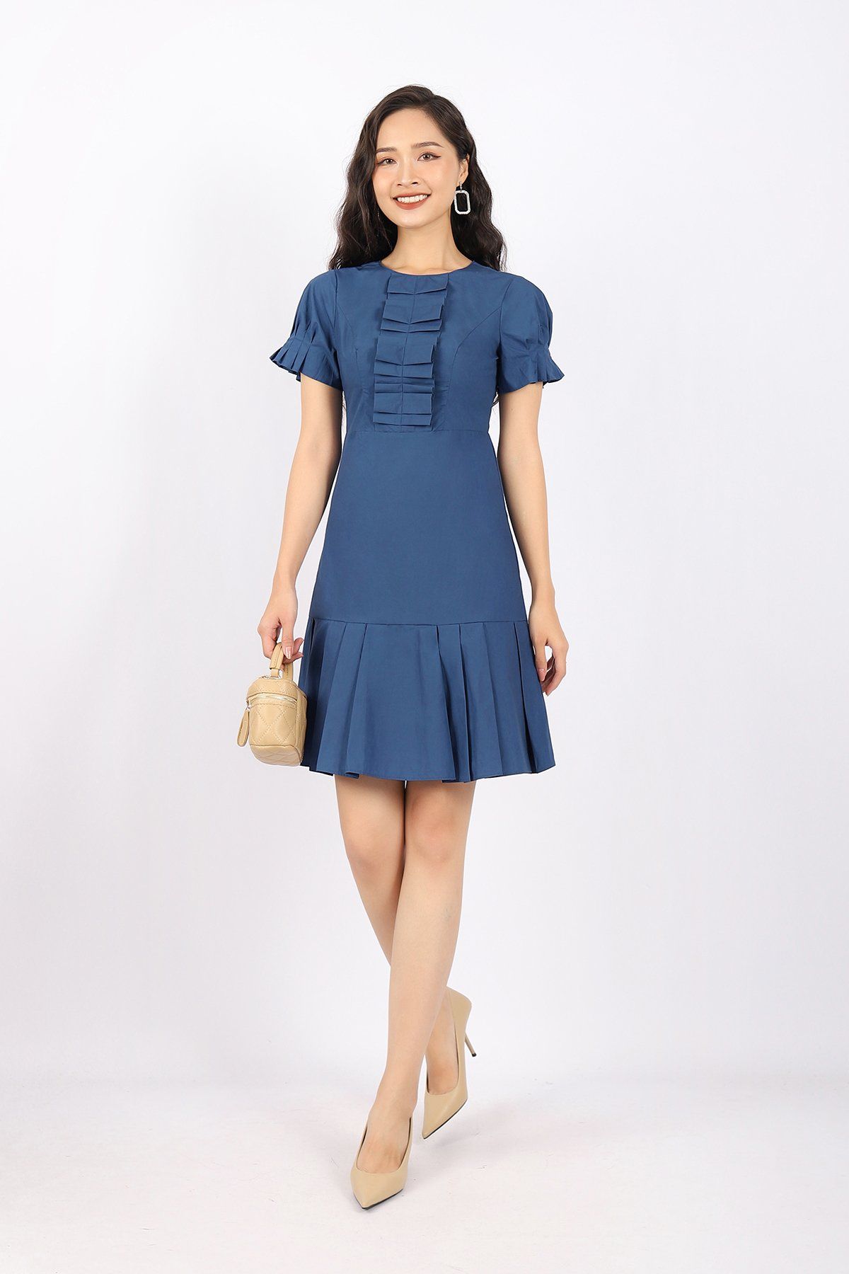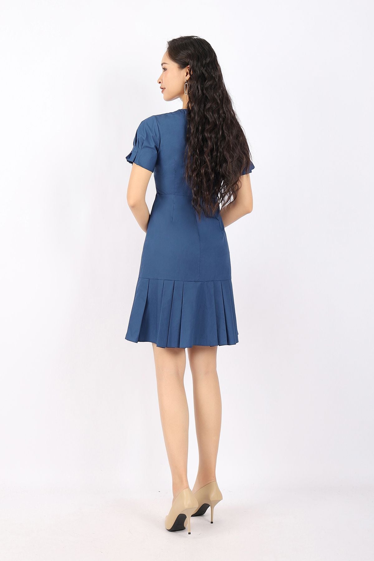 FDP33180 - Đầm dạo phố vải thô dáng suông chân xếp ly cổ tròn thân trang trí tay xếp mí tạo kiểu khóa thân sau - PANTIO