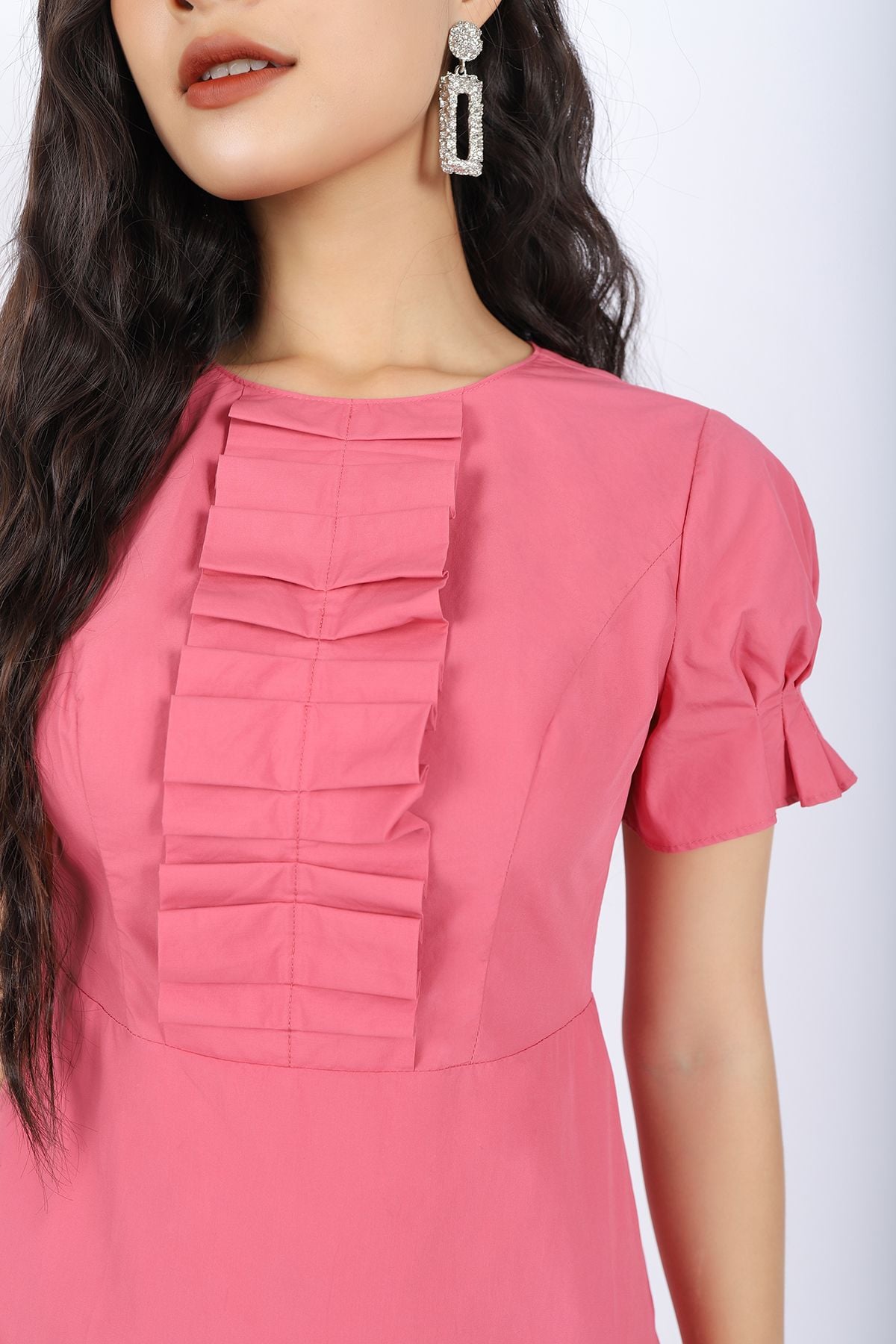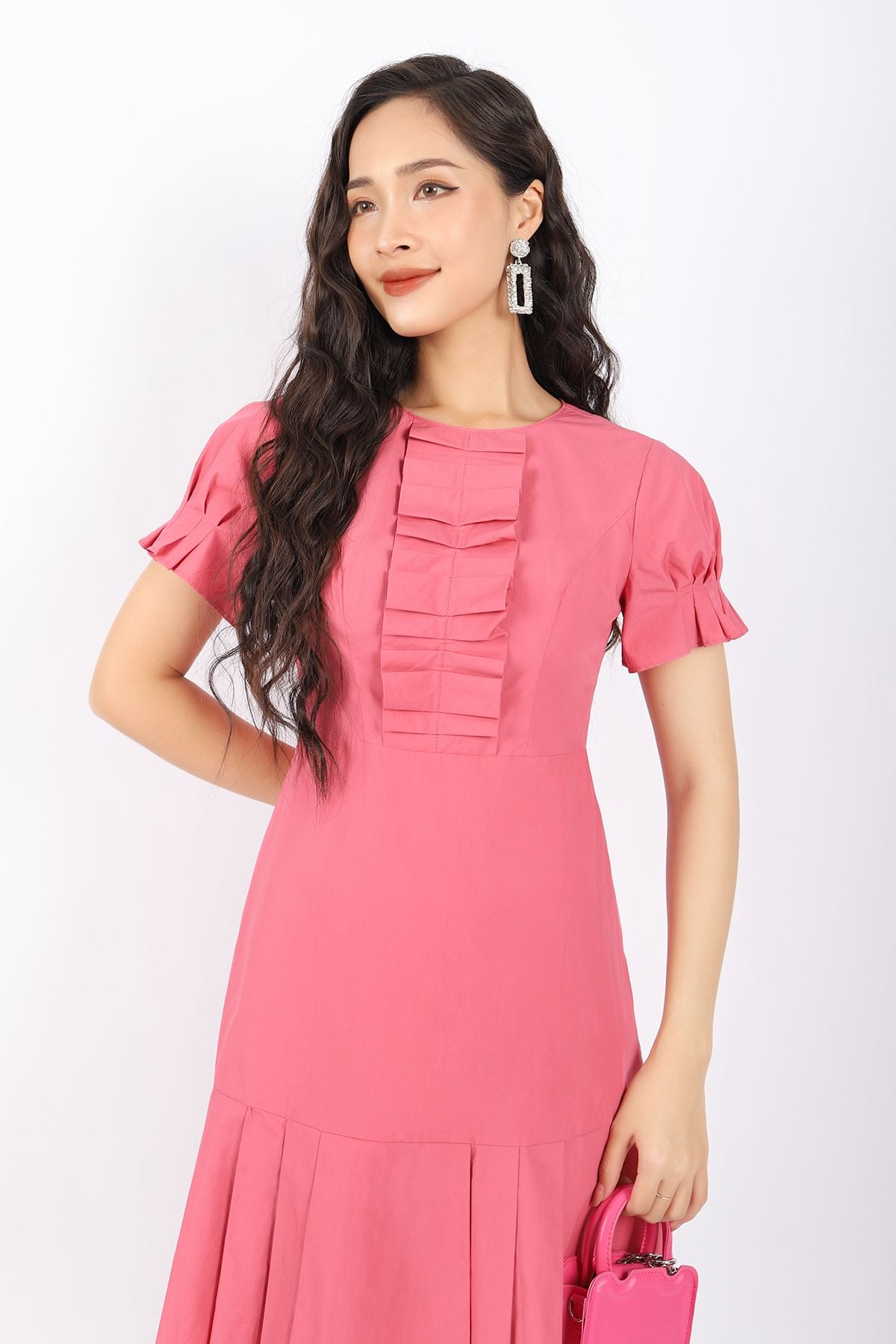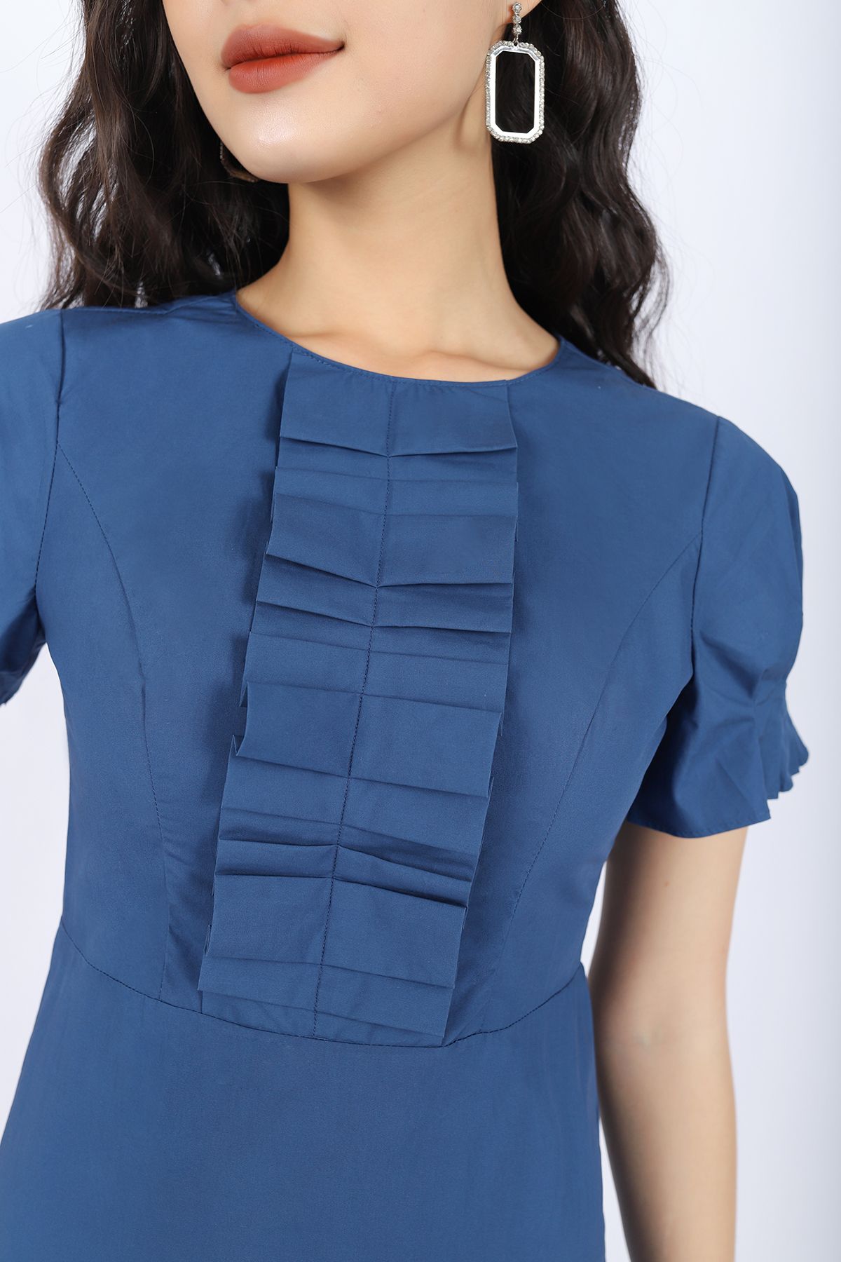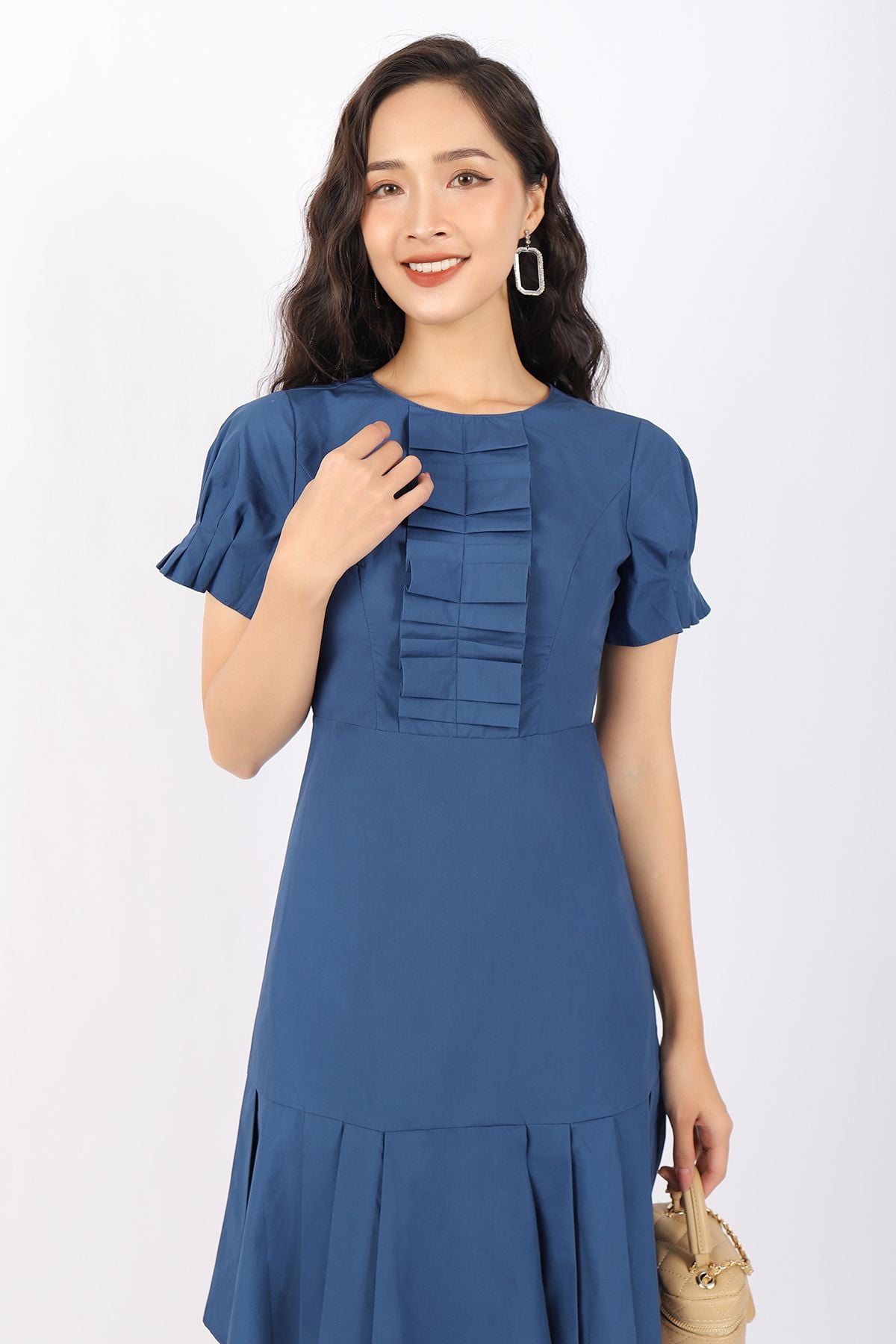 FDP33180 - Đầm dạo phố vải thô dáng suông chân xếp ly cổ tròn thân trang trí tay xếp mí tạo kiểu khóa thân sau - PANTIO