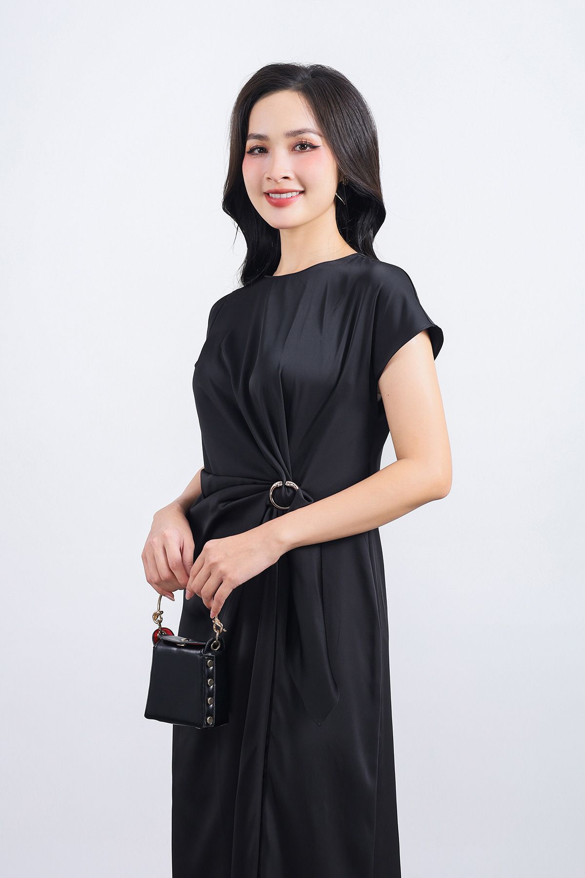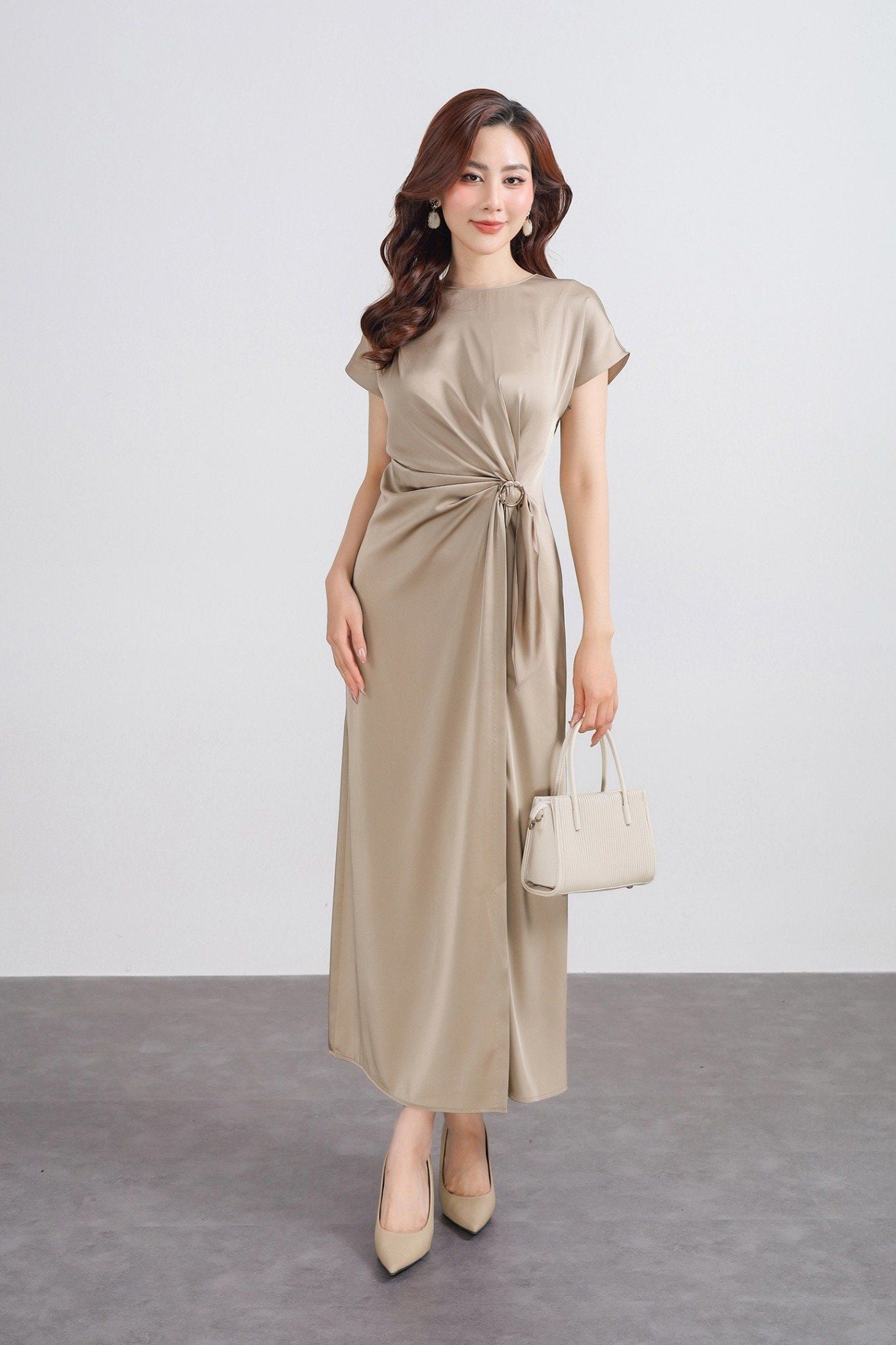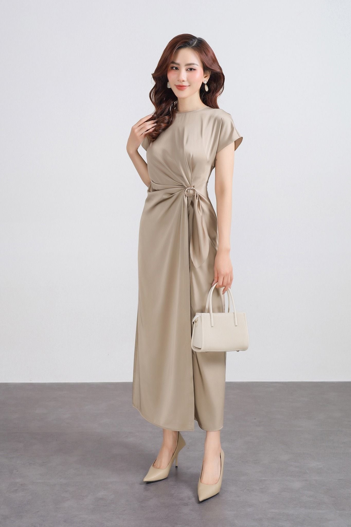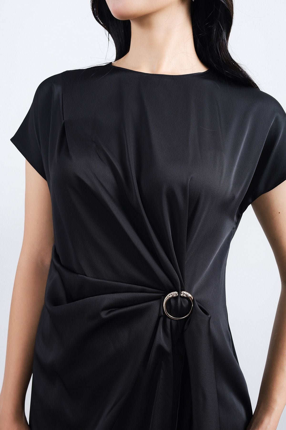 FDP33539 - Đầm dạo phố vải lụa satin dáng suông cổ tròn tay ngắn eo nhún phối kim loại tạo kiểu - PANTIO