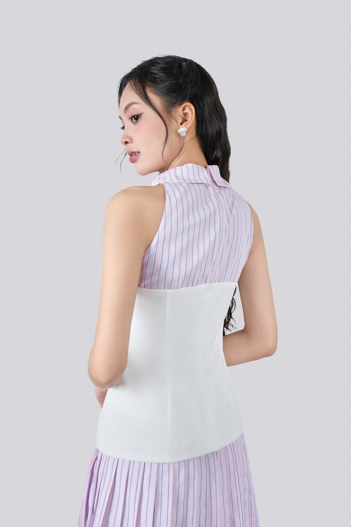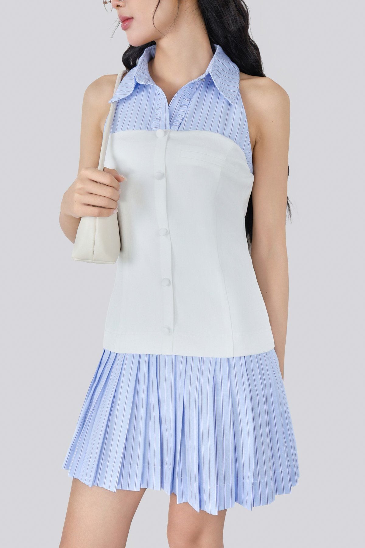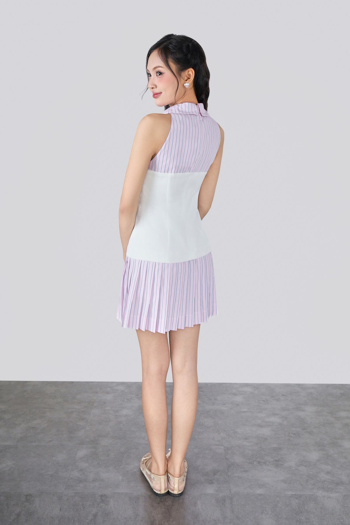 FDP33629 - Đầm dạo phố vải thô dáng suông cổ bẻ không tay gấu váy xếp ly tạo kiểu khoá thân sau - JAN.