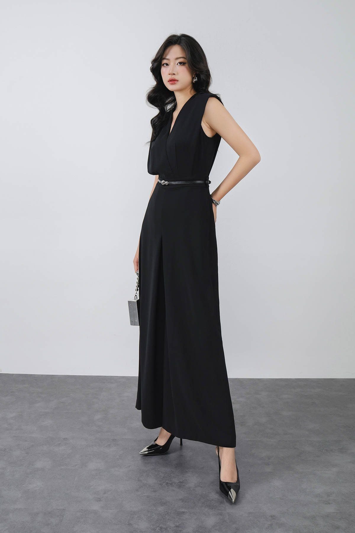 FJS3190 - Jumpsuit công sở vải tuytsi dáng ôm cổ xẻ V tay chờm có đệm vai quần ống rộng khoá thân sau kèm dây lưng tạo kiểu - PANTIO